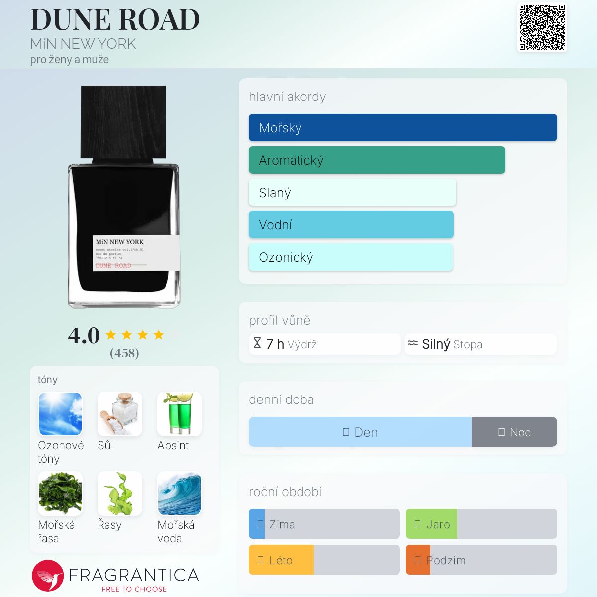 DUNE ROAD podle MiN NEW YORK je Woody Aromatic vůně pro ženy a muže. DUNE ROAD byl/a uveden/a v roce 2014. Vrchní tóny jsou Ozonové tóny, Absint a Kardamom; střední tóny jsouSůl, Mořská tráva, Řasy, Mořské tóny a Naplavené dříví ; základní tóny jsou Vetiver, Pižmo a Cedr.