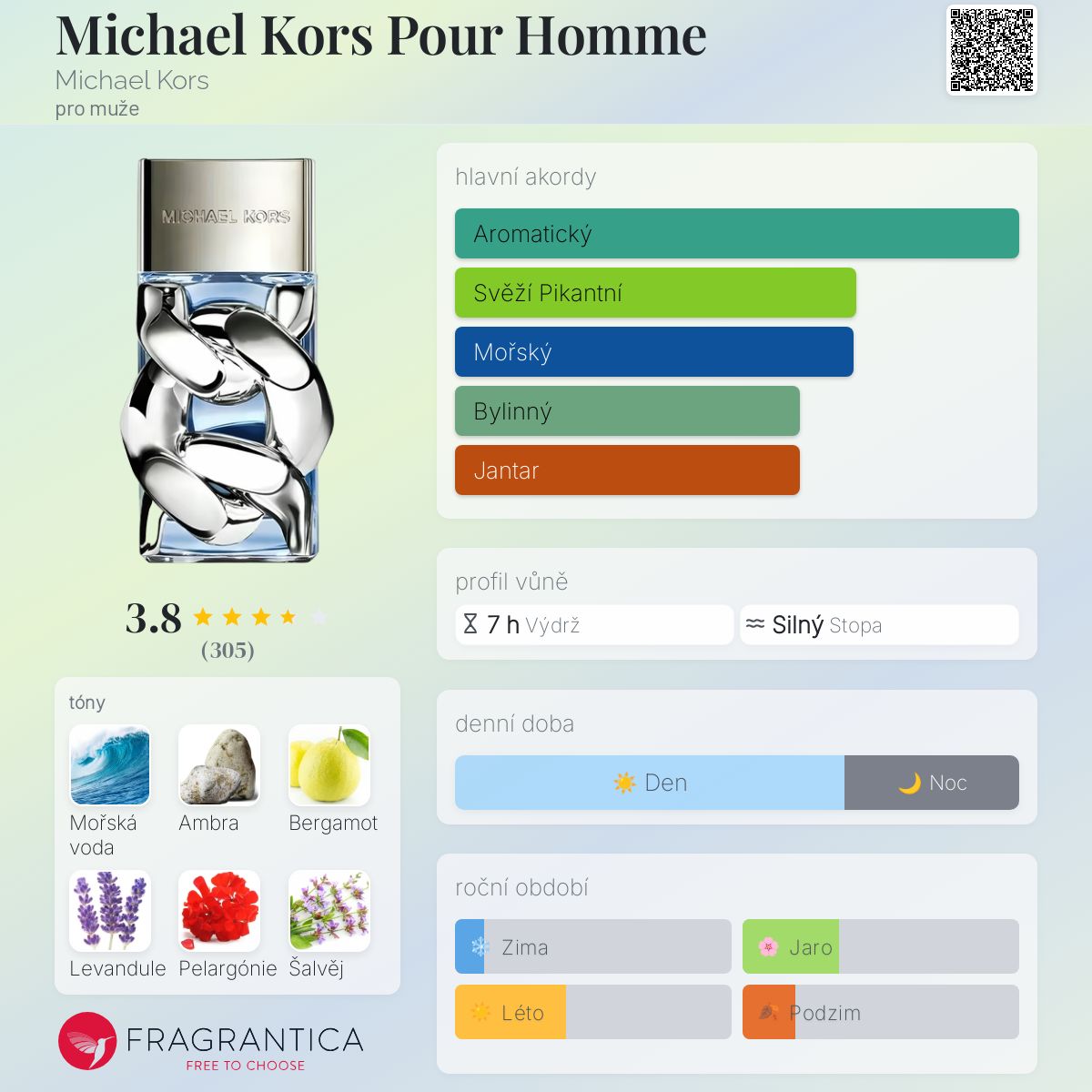 Michael Kors Pour Homme podle Michael Kors je Aromatic Aquatic vůně pro muže. Toto je nová vůně. Michael Kors Pour Homme byl/a uveden/a v roce 2024. "Nosem" za touto vůní je Jordi Fernández. Vrchní tóny jsou Bergamot, Levandule a Růžový pepř; střední tóny jsouMořská voda, Pelargónie a Šalvěj ; základní tóny jsou Ambra, Vetiver a Pačuli.