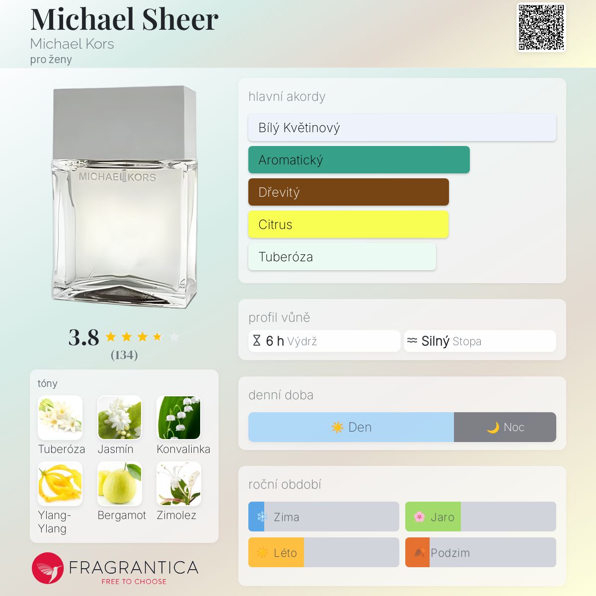 Michael Sheer podle Michael Kors je Floral Aquatic vůně pro ženy. Michael Sheer byl/a uveden/a v roce 2003. Vrchní tóny jsou Bergamot, Mořská voda, Mandarinka a Citron amalfi; střední tóny jsouTuberóza, Jasmín, Konvalinka, Ylang-Ylang, Zimolez, Měsíček, Růže, Černý rybíz, Hřebíček a Pelargónie ; základní tóny jsou Jantar (ambra), Pižmo, Otočník, Vetiver, Santalové dřevo a Virginský cedr.