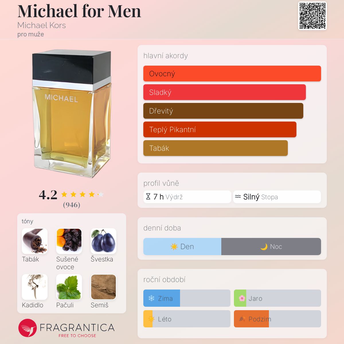 Michael for Men podle Michael Kors je Aromatic Fougere vůně pro muže. Michael for Men byl/a uveden/a v roce 2001. "Nosem" za touto vůní je Harry Fremont. Vrchní tóny jsou Badyán, Jedlová pryskyřice, Skořice, Kardamom, Estragon, Koriandr, Kmín a Bergamot; střední tóny jsouTabák, Kadidlo a Semiš ; základní tóny jsou Sušené ovoce, Švestka, Pačuli a Santalové dřevo.