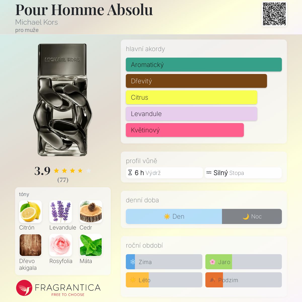 Pour Homme Absolu podle Michael Kors je Woody Aromatic vůně pro muže. Toto je nová vůně. Pour Homme Absolu byl/a uveden/a v roce 2025. Vrchní tóny jsou Citrón, Máta peprná, Kardamom a Růžový pepř; střední tóny jsouLevandule, Rosyfolia, Mahonial a Kadidlo ; základní tóny jsou Cedr, Dřevo akigala a Vetiver.
