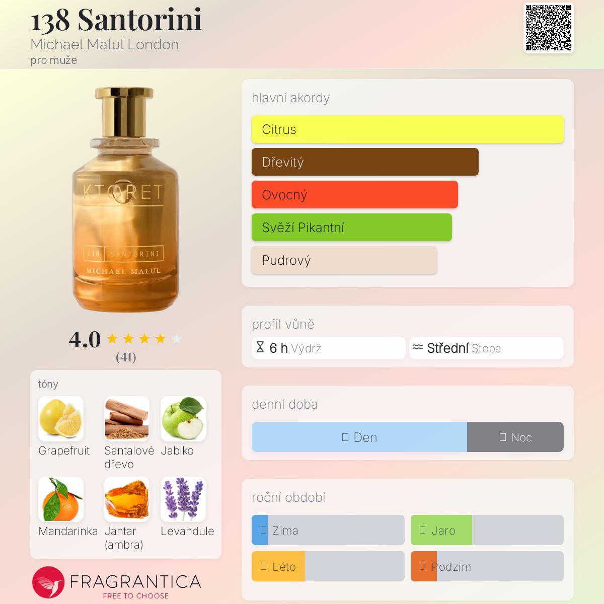 138 Santorini podle Michael Malul London je Aromatic Fruity vůně pro muže. 138 Santorini byl/a uveden/a v roce 2020. 138 Santorini byl/a vytvořen/a Roger Howell a Frank Voelkl. Vrchní tóny jsou Grapefruit, Jablko a Mandarinka; střední tóny jsouLevandule, Jasmín a Muškátový oříšek ; základní tóny jsou Santalové dřevo, Jantar (ambra) a Pačuli.