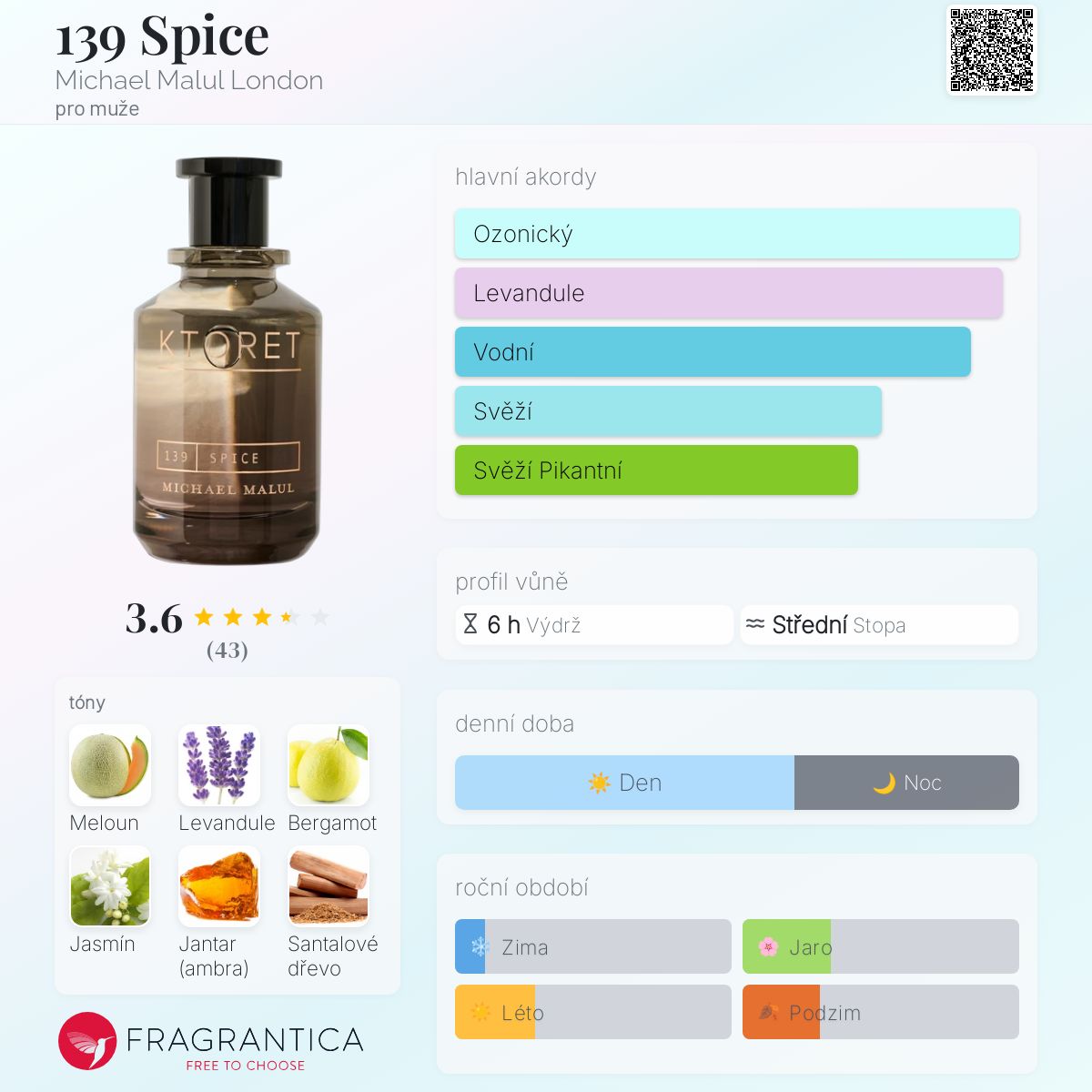 139 Spice podle Michael Malul London je Woody Spicy vůně pro muže. 139 Spice byl/a uveden/a v roce 2020. 139 Spice byl/a vytvořen/a Roger Howell a Frank Voelkl. Vrchní tóny jsou Meloun a Bergamot; střední tóny jsouLevandule, Jasmín a Šalvěj ; základní tóny jsou Jantar (ambra), Santalové dřevo a Pačuli.