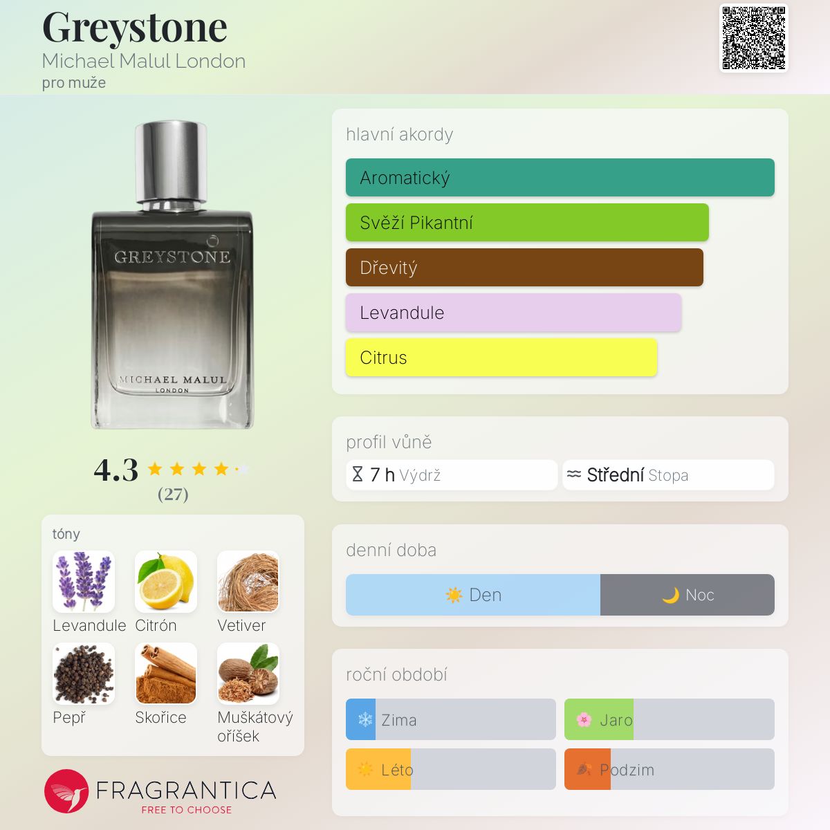 Greystone podle Michael Malul London je vůně pro muže. Greystone byl/a uveden/a v roce 2022. Vrchní tóny jsou Italský citrón, Černý pepř a Skořice; střední tóny jsouLevandule, Muškátový oříšek a Elimi ; základní tóny jsou Haitský vetiver, Borovice a Santalové dřevo.
