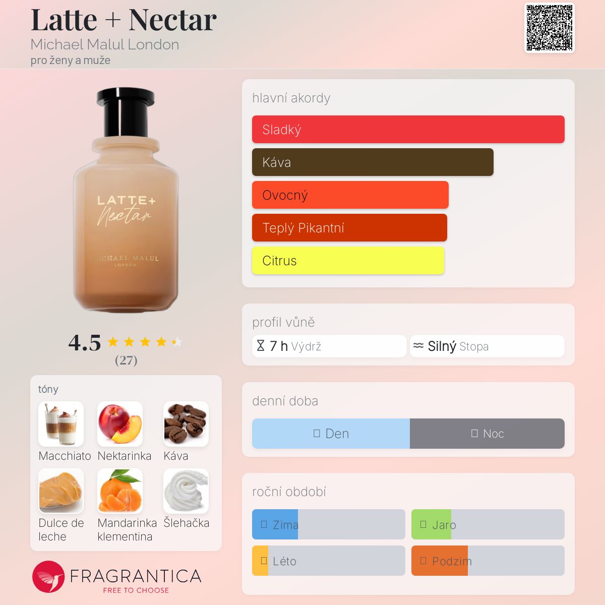 Latte + Nectar podle Michael Malul London je Floral Woody Musk vůně pro ženy a muže. Toto je nová vůně. Latte + Nectar byl/a uveden/a v roce 2025. Latte + Nectar byl/a vytvořen/a Doug Falcone a Kevin Scozzaro. Vrchní tóny jsou Nektarinka, Dulce de leche a Mandarinka klementina; střední tóny jsouMacchiato, Káva, Pomerančový květ a Jasmín ; základní tóny jsou Šlehačka, Jantar (ambra) a Pižmo.