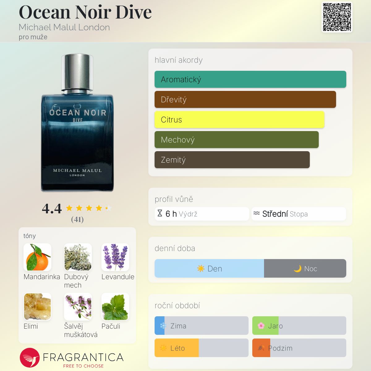 Ocean Noir Dive podle Michael Malul London je vůně pro muže. Ocean Noir Dive byl/a uveden/a v roce 2022. Vrchní tóny jsou Mandarinka, Šalvěj muškátová a Černý pepř; střední tóny jsouLevandule, Elimi a Labdanum ; základní tóny jsou Dubový mech, List indonéského pačuli a Santalové dřevo.