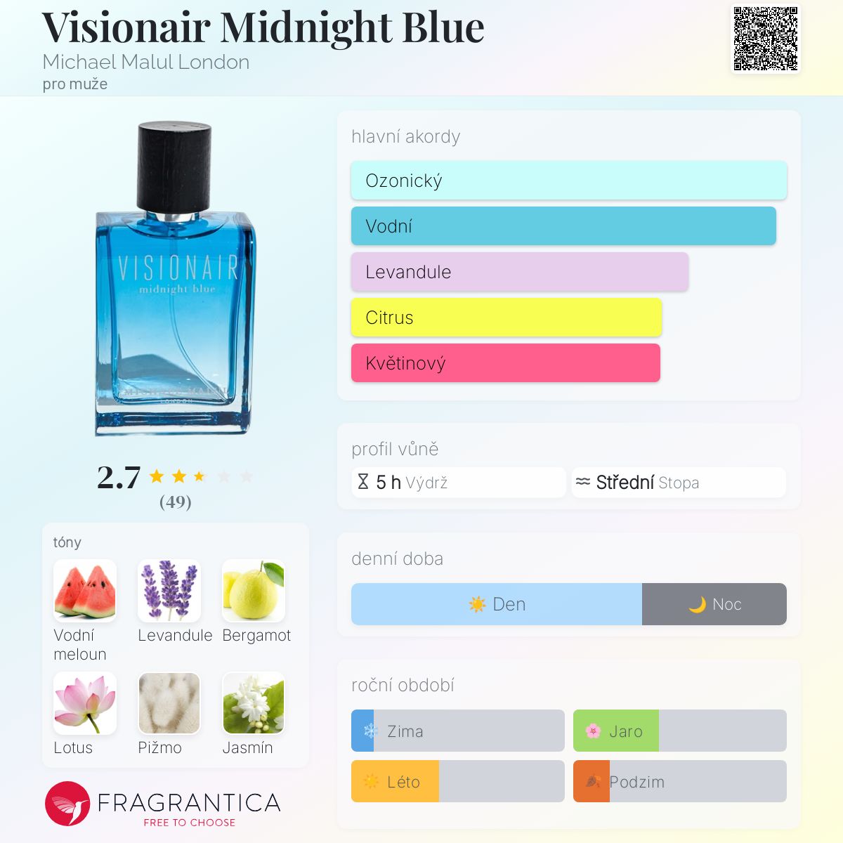 Visionair Midnight Blue podle Michael Malul London je vůně pro muže. Visionair Midnight Blue byl/a uveden/a v roce 2020. Vrchní tóny jsou Vodní meloun, Levandule a Bergamot; střední tóny jsouLotus a Jasmín ; základní tóny jsou Pižmo, Santalové dřevo a Jantar (ambra).