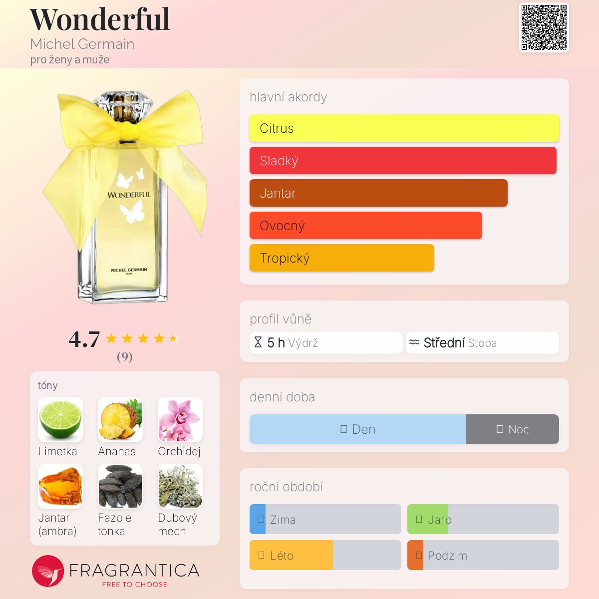 Wonderful podle Michel Germain je Floral Fruity Gourmand vůně pro ženy a muže. Toto je nová vůně. Wonderful byl/a uveden/a v roce 2024. Vrchní tóny jsou Limetka, Ananas a Růžový pepř; střední tóny jsouVanilková orchidej, Jasmín mnohokvětý a Magnólie ; základní tóny jsou Bílý jantar (ambra), Fazole tonka, Mech a Santalové dřevo.