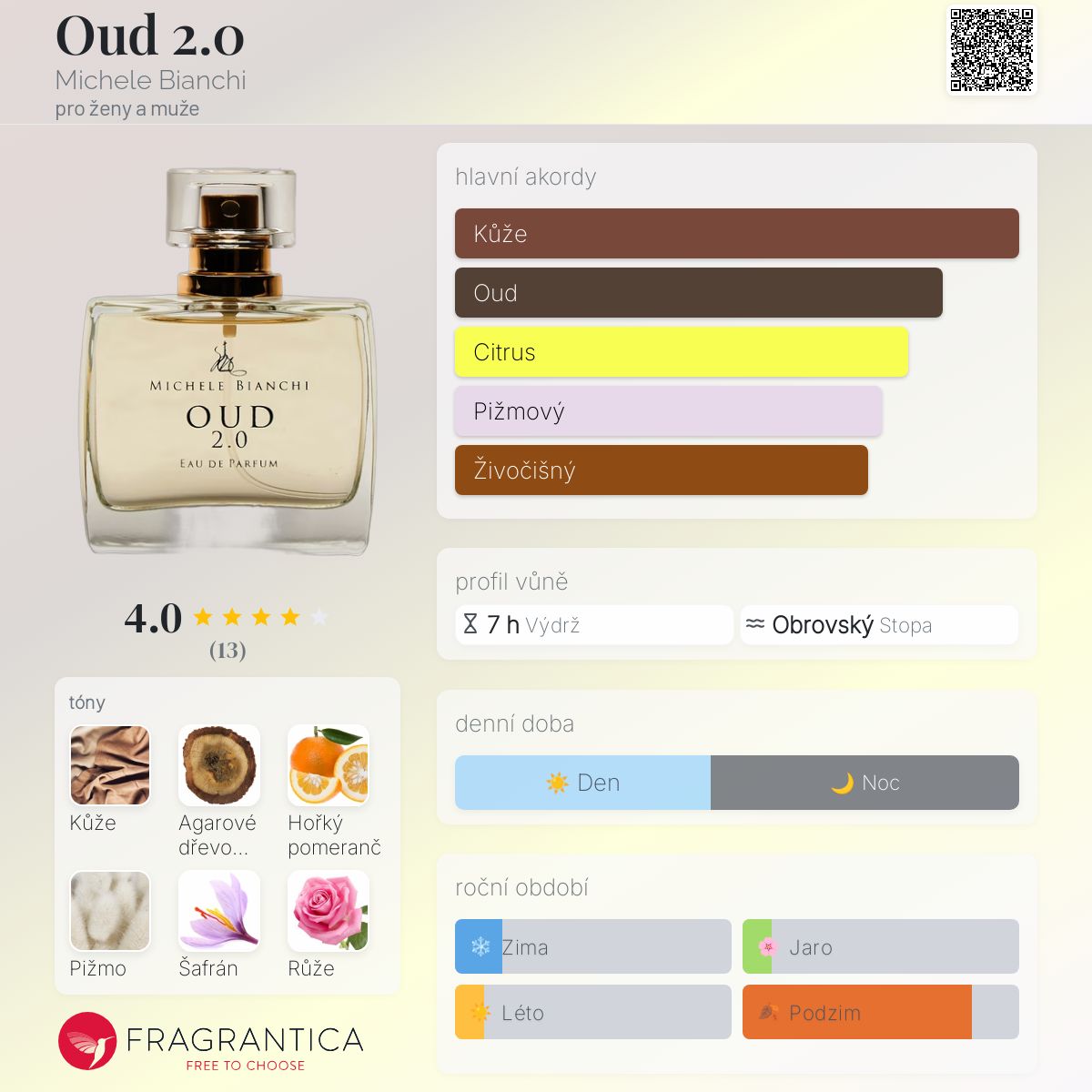 Oud 2.0 podle Michele Bianchi je Woody vůně pro ženy a muže. Oud 2.0 byl/a uveden/a v roce 2018. "Nosem" za touto vůní je Michele Bianchi. Vrchní tón je Hořký pomeranč ; střední tóny jsouAgarové dřevo (oud), Šafrán a Růže ; základní tóny jsou Kůže, Pižmo, Pačuli a Jantar (ambra).