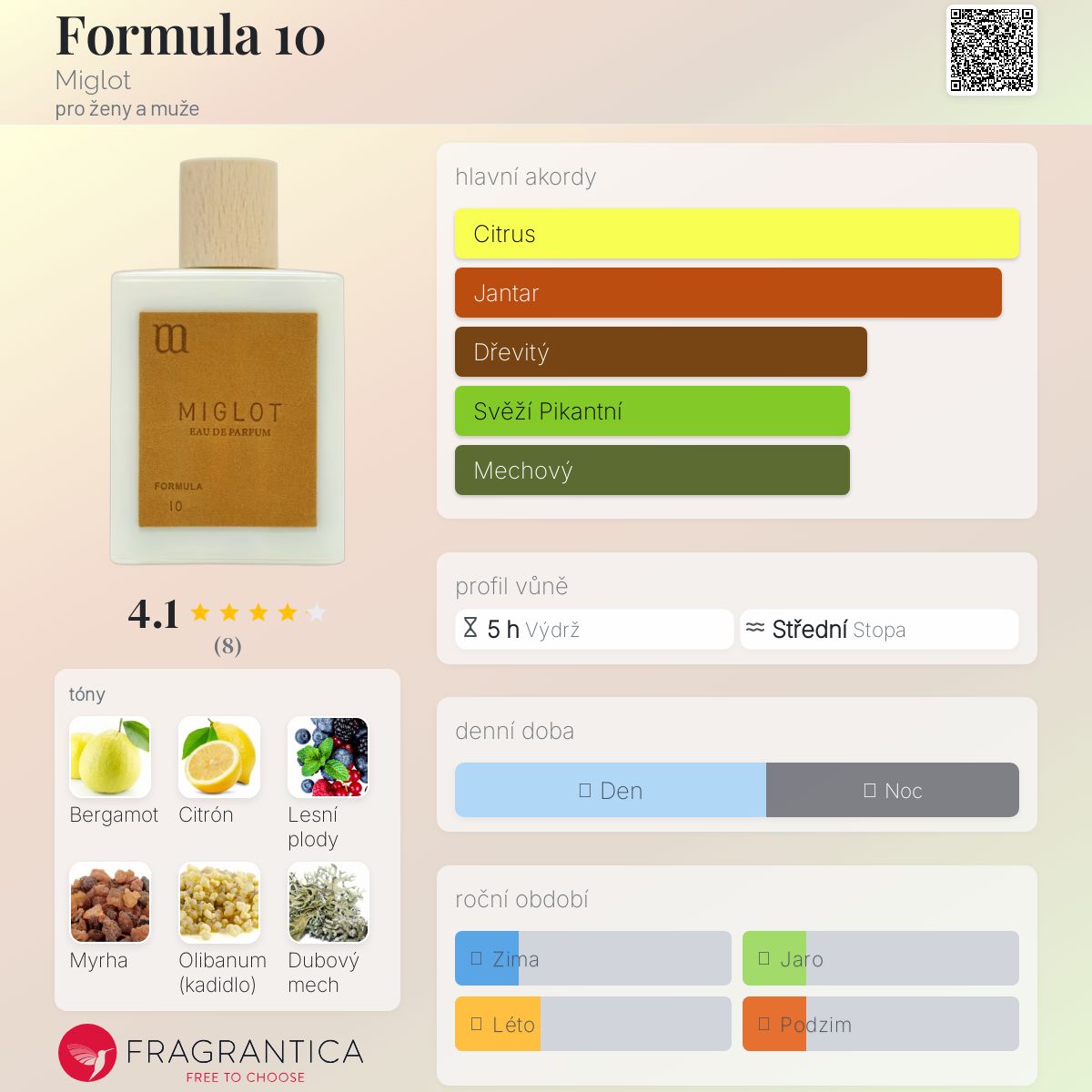 Formula 10 podle Miglot je Woody Aromatic vůně pro ženy a muže. Formula 10 byl/a uveden/a v roce 2019. "Nosem" za touto vůní je Kristof Lefebre. Vrchní tóny jsou Bergamot, Citrón a Lesní plody; střední tóny jsouMyrha a Olibanum ; základní tón je Dubový mech.