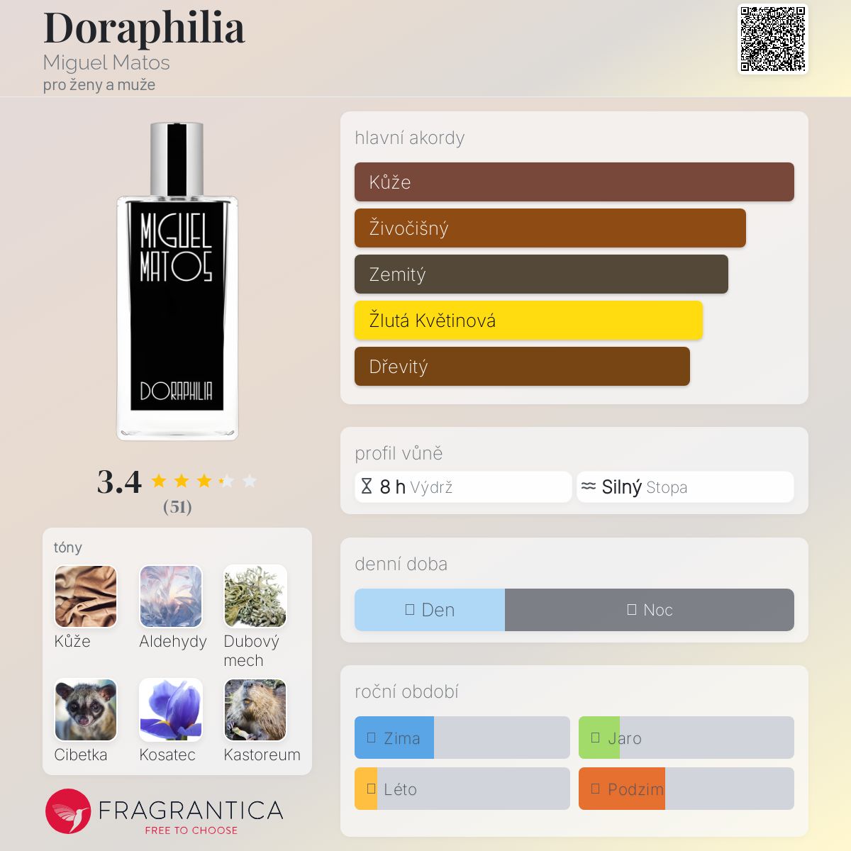 Doraphilia podle Miguel Matos je Leather vůně pro ženy a muže. Doraphilia byl/a uveden/a v roce 2019. "Nosem" za touto vůní je Miguel Matos. Vrchní tóny jsou Aldehydy, Šeřík a Bergamot; střední tóny jsouKůže, Kosatec, Narcis, Mimóza, Ylang-Ylang a Růže ; základní tóny jsou Ruská kůže, Cedrový mech, Cibetka, Kastoreum, Chrpovník lopuchový a Pačuli.