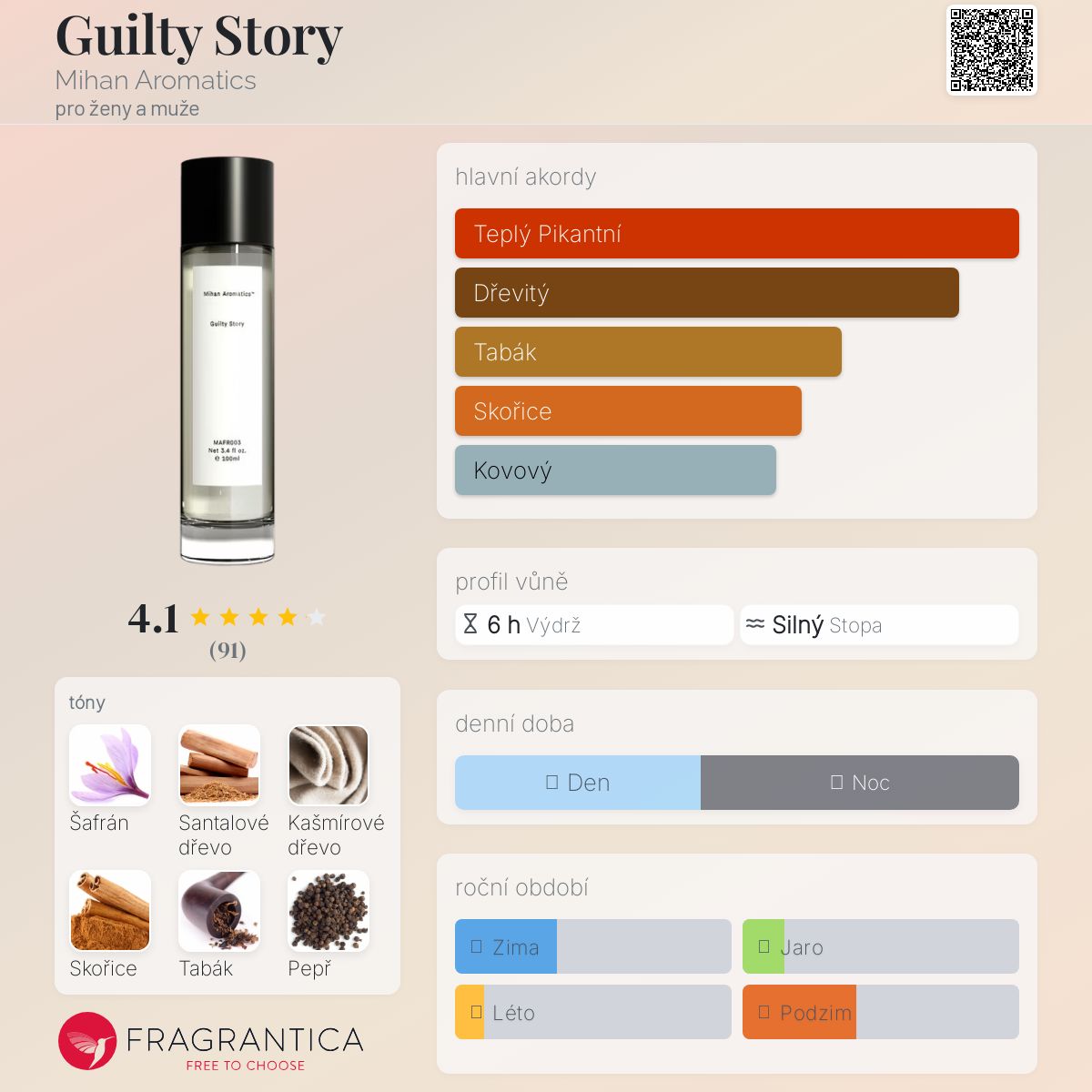 Guilty Story podle Mihan Aromatics je Aromatic Spicy vůně pro ženy a muže. Guilty Story byl/a uveden/a v roce 2017. Vrchní tóny jsou Černý pepř a Bergamot; střední tóny jsouŠafrán, Čínské skořicové dřevo a Tabák ; základní tóny jsou Santalové dřevo a Kašmírové dřevo.