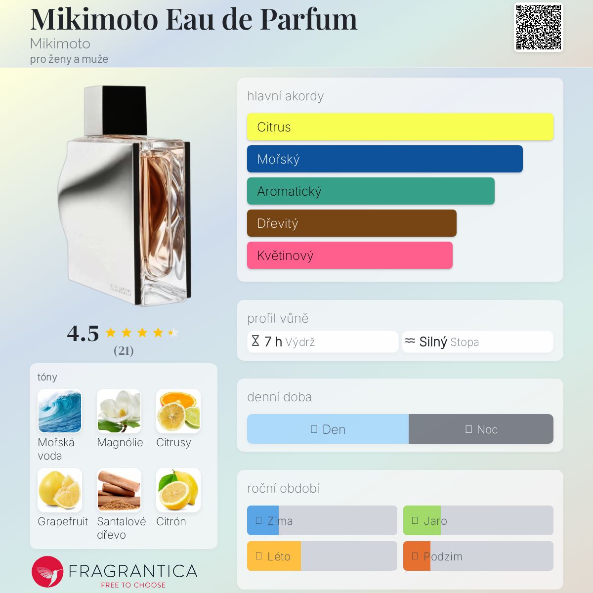 Mikimoto Eau de Parfum podle Mikimoto je Orientální Floral vůně pro ženy a muže. Mikimoto Eau de Parfum byl/a uveden/a v roce 2020. "Nosem" za touto vůní je Frank Voelkl. Vrchní tóny jsou Mořské tóny, Citrusy, Grapefruit, Sicilský citron a Bergamot; střední tóny jsouMagnólie, Kosatec a Kadidlo ; základní tóny jsou Santalové dřevo, Dřevité tóny a Šafrán.