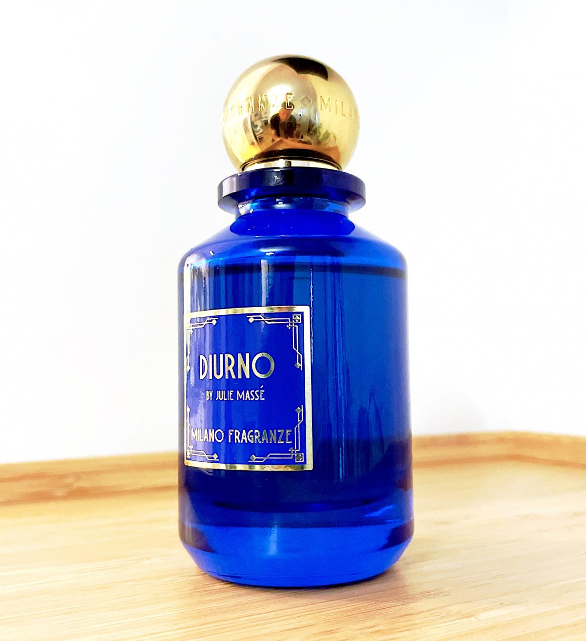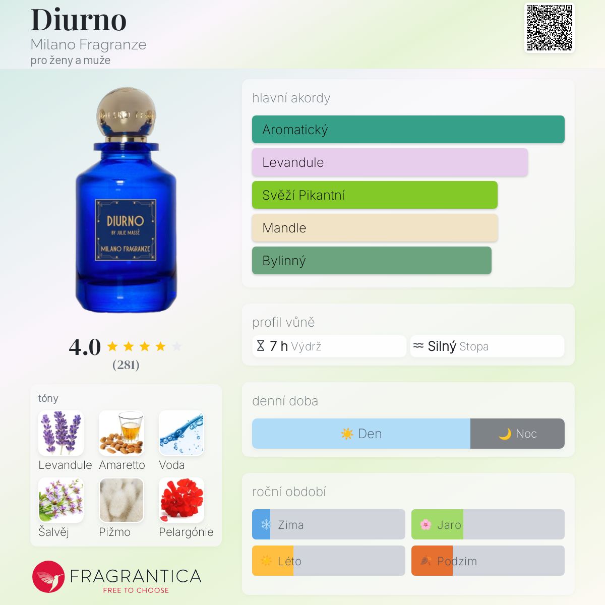 Diurno podle Milano Fragranze je vůně pro ženy a muže. Diurno byl/a uveden/a v roce 2021. "Nosem" za touto vůní je Julie Massé. Vrchní tóny jsou Levandule a Amaretto; střední tóny jsouŠalvěj a Bourbonské geránium ; základní tóny jsou Vodní tóny, Bílé pižmo a Cedr.