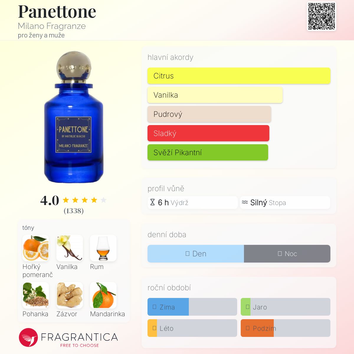 Panettone podle Milano Fragranze je vůně pro ženy a muže. Panettone byl/a uveden/a v roce 2021. "Nosem" za touto vůní je Mathilde Bijaoui. Vrchní tóny jsou Hořký pomeranč, Zázvor, Mandarinka, Semena mrkve a Davana; střední tóny jsouRum, Slaměnka a Aksamitník ; základní tóny jsou Vanilka a Pohanka.