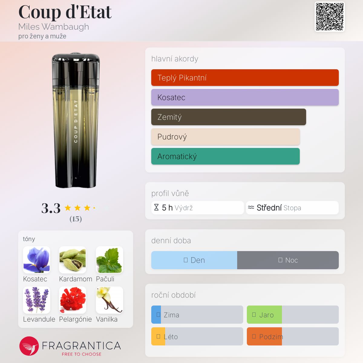 Coup d'Etat podle Miles Wambaugh je Orientální vůně pro ženy a muže. Coup d'Etat byl/a uveden/a v roce 2019. Coup d'Etat byl/a vytvořen/a Dominique Ropion a Jean-Louis Sieuzac. Vrchní tóny jsou Kardamom a Levandule; střední tóny jsouKosatec a Pelargónie ; základní tóny jsou Pačuli, Vanilka a Cypriolový olej.