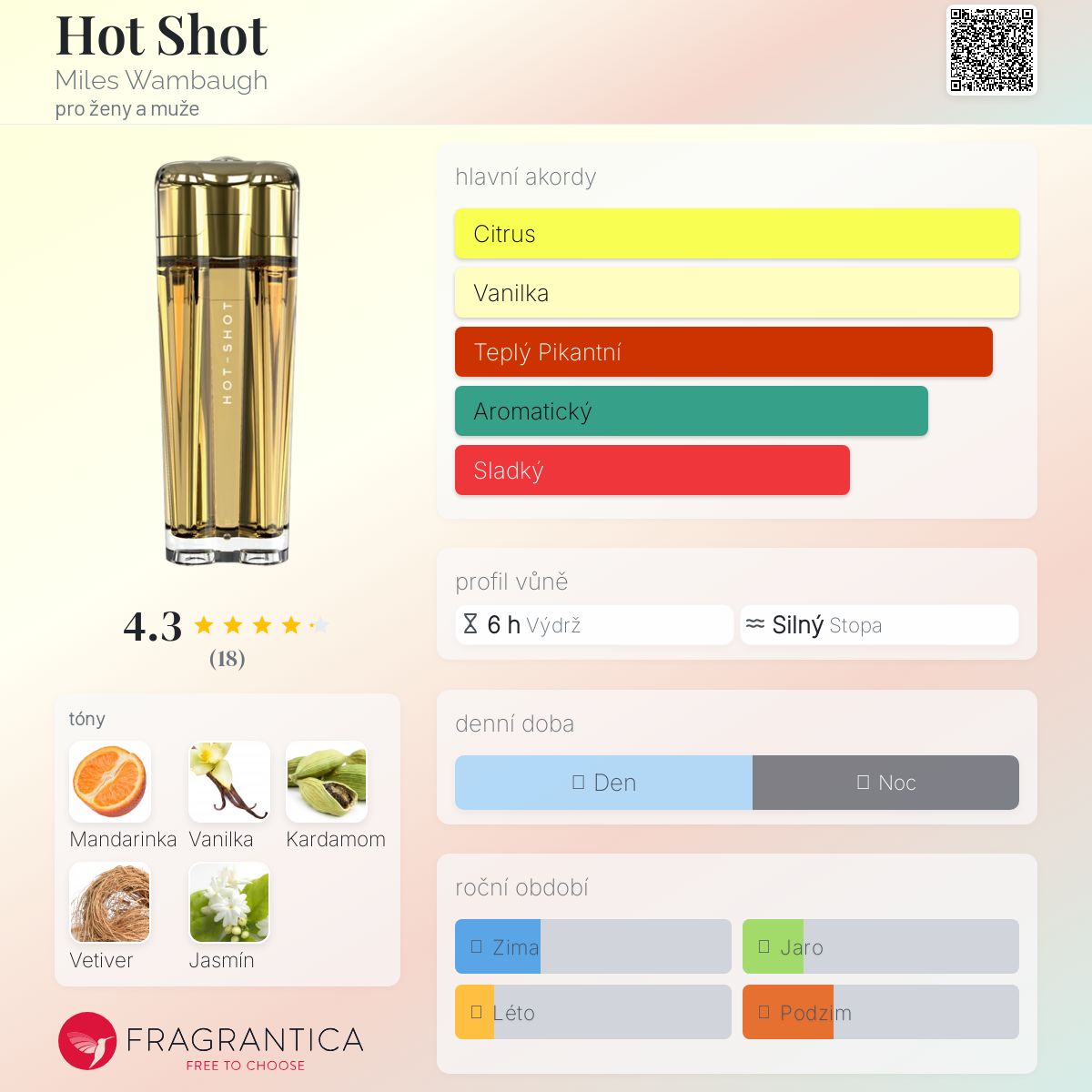 Hot Shot podle Miles Wambaugh je Orientální Spicy vůně pro ženy a muže. Hot Shot byl/a uveden/a v roce 2019. Hot Shot byl/a vytvořen/a Dominique Ropion a Jean-Louis Sieuzac. Vrchní tóny jsou Mandarinka a Kardamom; střední tón jeJasmín Sambac ; základní tóny jsou Vanilka a Haitský vetiver.