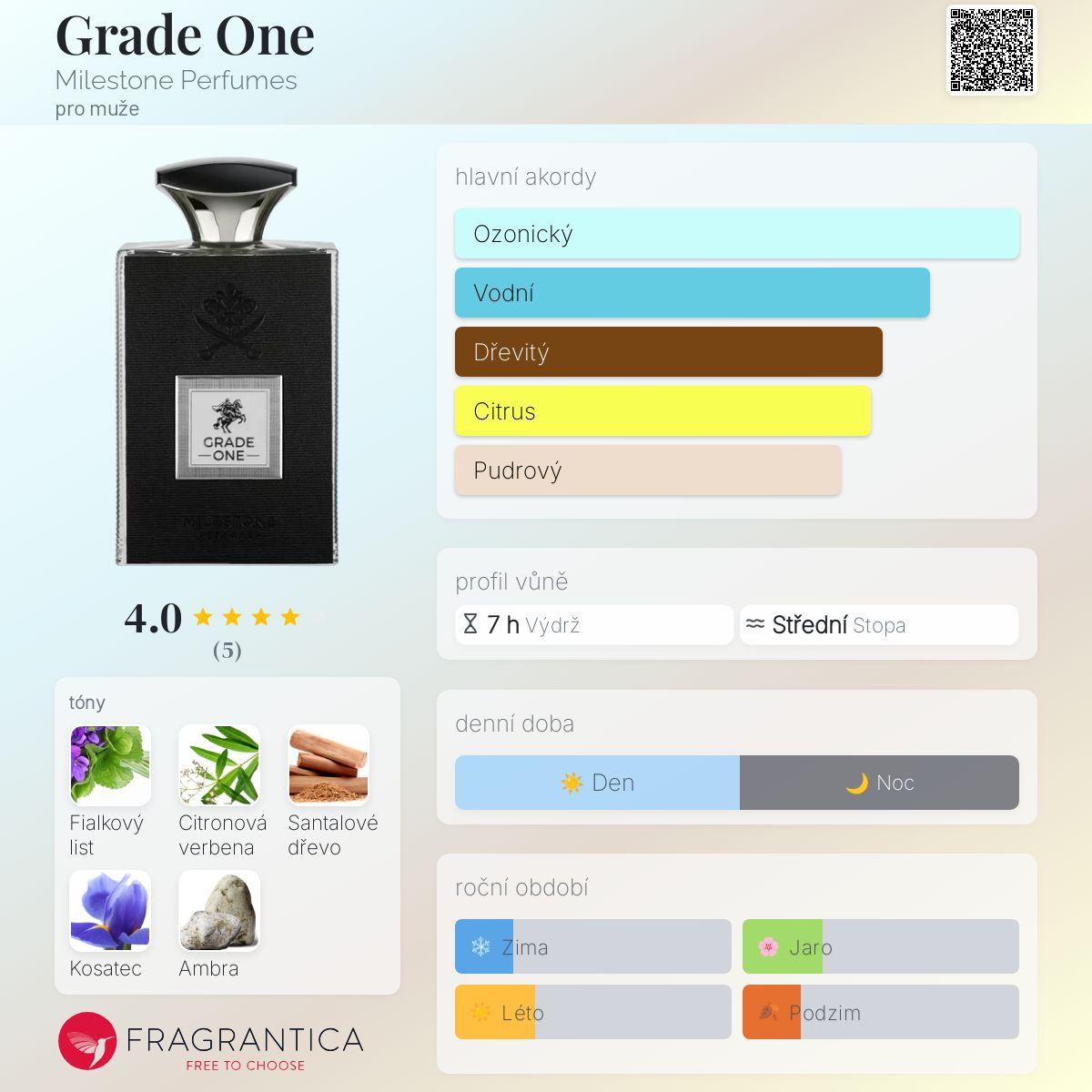 Grade One podle Milestone Perfumes je vůně pro muže. Grade One byl/a uveden/a v roce 2022. Vrchní tóny jsou Citronová verbena a Kosatec; střední tón jeFialkový list ; základní tóny jsou Santalové dřevo a Ambra.