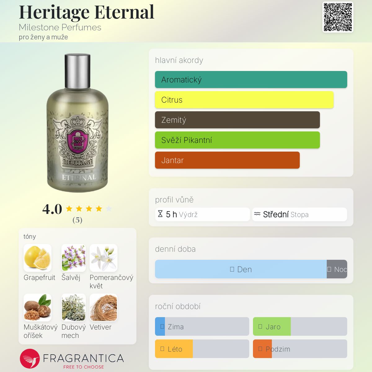 Heritage Eternal podle Milestone Perfumes je Orientální Spicy vůně pro ženy a muže. Heritage Eternal byl/a uveden/a v roce 2023. Vrchní tóny jsou Grapefruit a Šalvěj; střední tóny jsouPomerančový květ a Muškátový oříšek ; základní tóny jsou Dubový mech, Vetiver a Jantar (ambra).