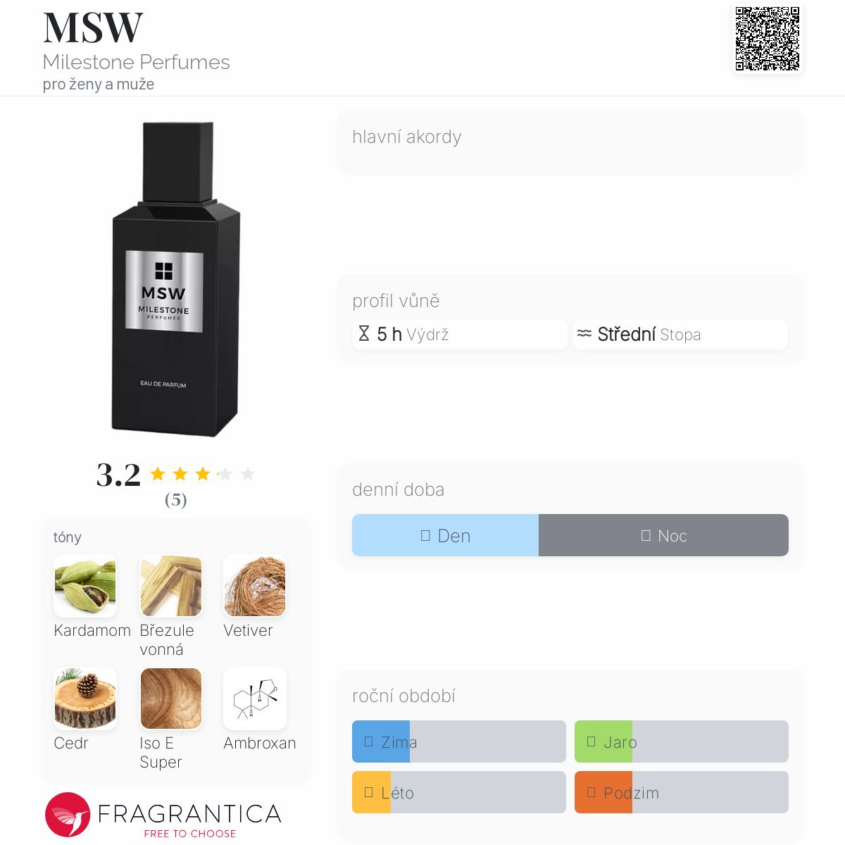 MSW podle Milestone Perfumes je vůně pro ženy a muže. MSW byl/a uveden/a v roce 2022. Vrchní tón je Guatemalský kardamom ; střední tón jeBřezule vonná ; základní tóny jsou Haitský vetiver, Virginský cedr, Atlasový cedr, Iso E Super a Ambroxan.