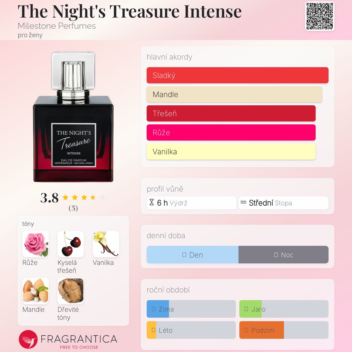 The Night's Treasure Intense podle Milestone Perfumes je Floral Fruity vůně pro ženy. The Night's Treasure Intense byl/a uveden/a v roce 2023. Vrchní tón je Damašská růže ; střední tón jeKyselá třešeň ; základní tóny jsou Mandlové mléko, Madagaskarská vanilka a Dřevité tóny.
