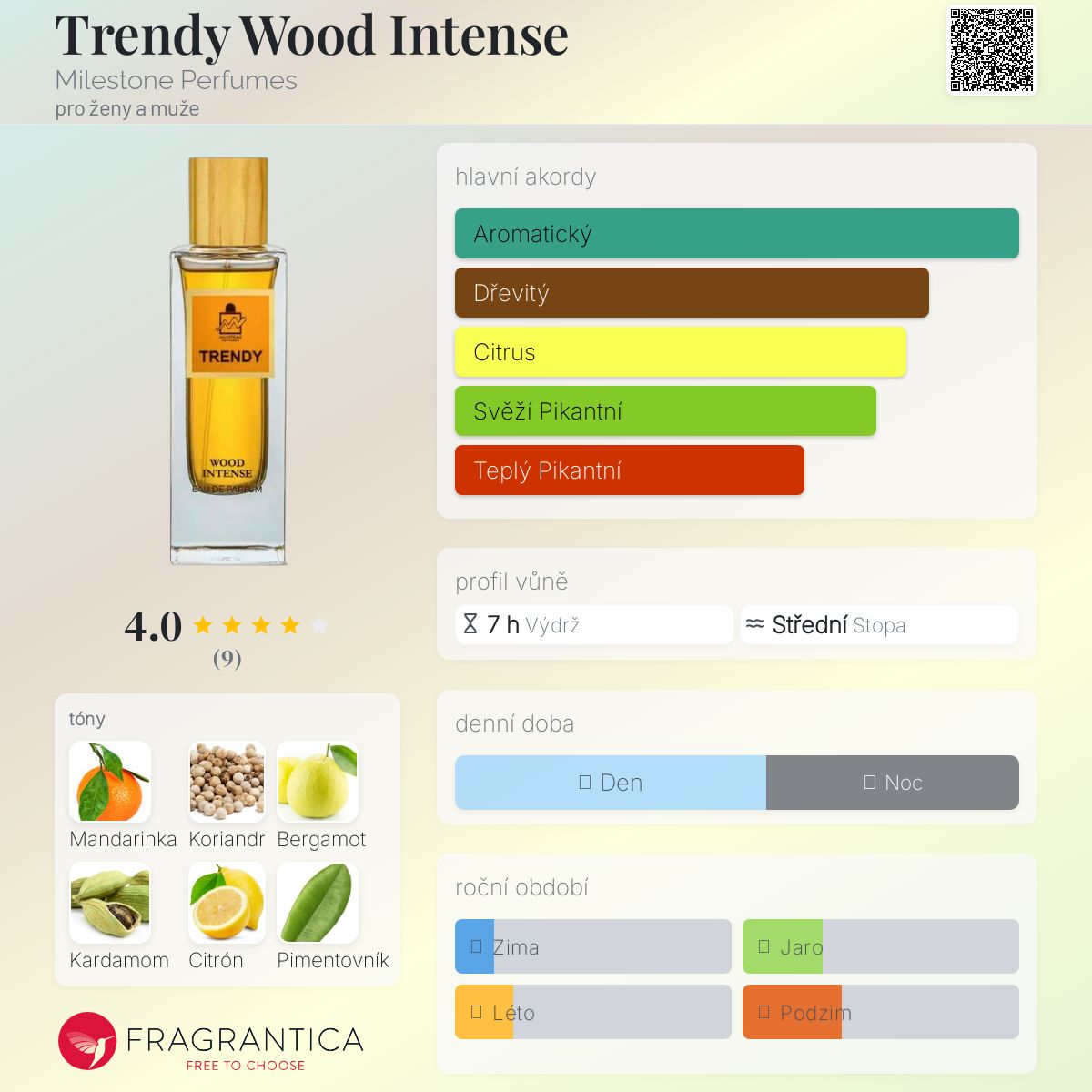 Trendy Wood Intense podle Milestone Perfumes je Woody Aromatic vůně pro ženy a muže. Trendy Wood Intense byl/a uveden/a v roce 2023. Vrchní tóny jsou Mandarinka, Koriandr, Bergamot, Kardamom a Citrón; střední tóny jsouPimentovník, Pelargónie, Jasmín a Cypřiš ; základní tóny jsou Santalové dřevo, Dubový mech a Cedr.