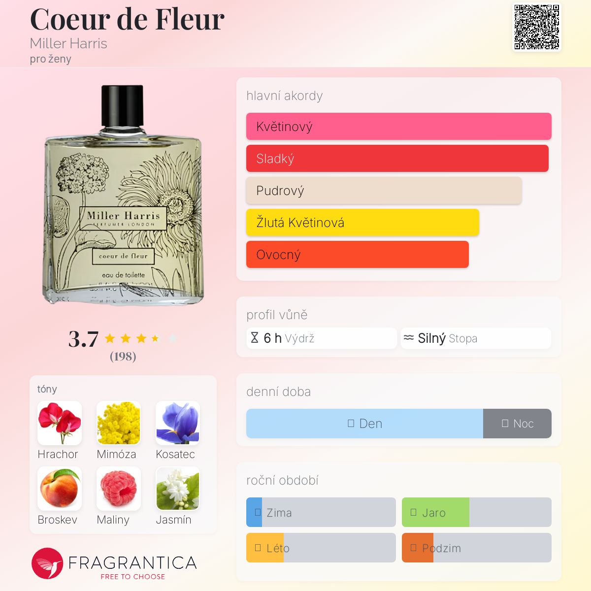 Coeur de Fleur podle Miller Harris je Floral vůně pro ženy. Coeur de Fleur byl/a uveden/a v roce 2000. "Nosem" za touto vůní je Lyn Harris. Vrchní tóny jsou Hrachor a Mimóza; střední tóny jsouKosatec, Broskev a Maliny ; základní tóny jsou Egyptský jasmín, Jantar (ambra) a Vanilka.