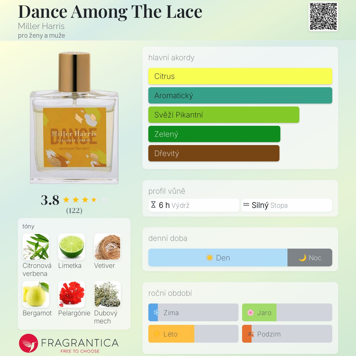 Dance Among The Lace podle Miller Harris je Citrus Aromatic vůně pro ženy a muže. Dance Among The Lace byl/a uveden/a v roce 2019. "Nosem" za touto vůní je Bertrand Duchaufour. Vrchní tóny jsou Citronová verbena, Limetka, Máta, Červené bobule a Kardamom; střední tóny jsouBergamot, Bourbonské geránium , Fenykl, Černý rybíz a Andělika ; základní tóny jsou Vetiver, Mech, Pižmo, Myrha a Santalové dřevo.