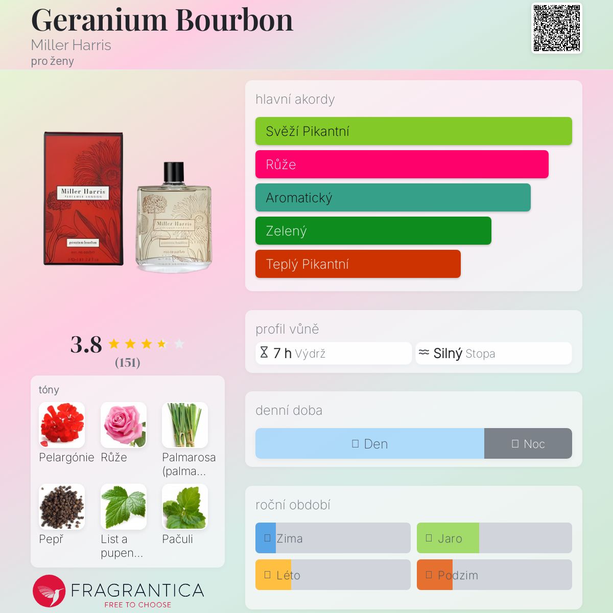 Geranium Bourbon podle Miller Harris je Floral vůně pro ženy. Vrchní tóny jsou Pelargónie, Palmarosa (palma růžová) a Černý rybíz; střední tóny jsouRůže, Černý pepř a Fialka ; základní tóny jsou Pačuli, Jantar (ambra) a Vanilka.