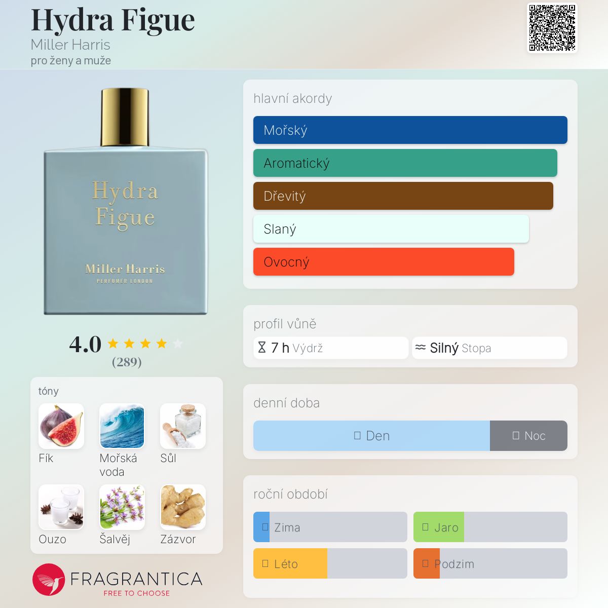 Hydra Figue podle Miller Harris je vůně pro ženy a muže. Hydra Figue byl/a uveden/a v roce 2023. "Nosem" za touto vůní je Emilie Bouge. Vrchní tóny jsou Ouzo, Zázvor, Bergamot, Kardamom, Citrón a Šafrán; střední tóny jsouFík, Mořské tóny, Mořská sůl, Šalvěj, Nocenka a Tuberóza ; základní tóny jsou Santalové dřevo, Dub, Pižmo a Ambroxan.