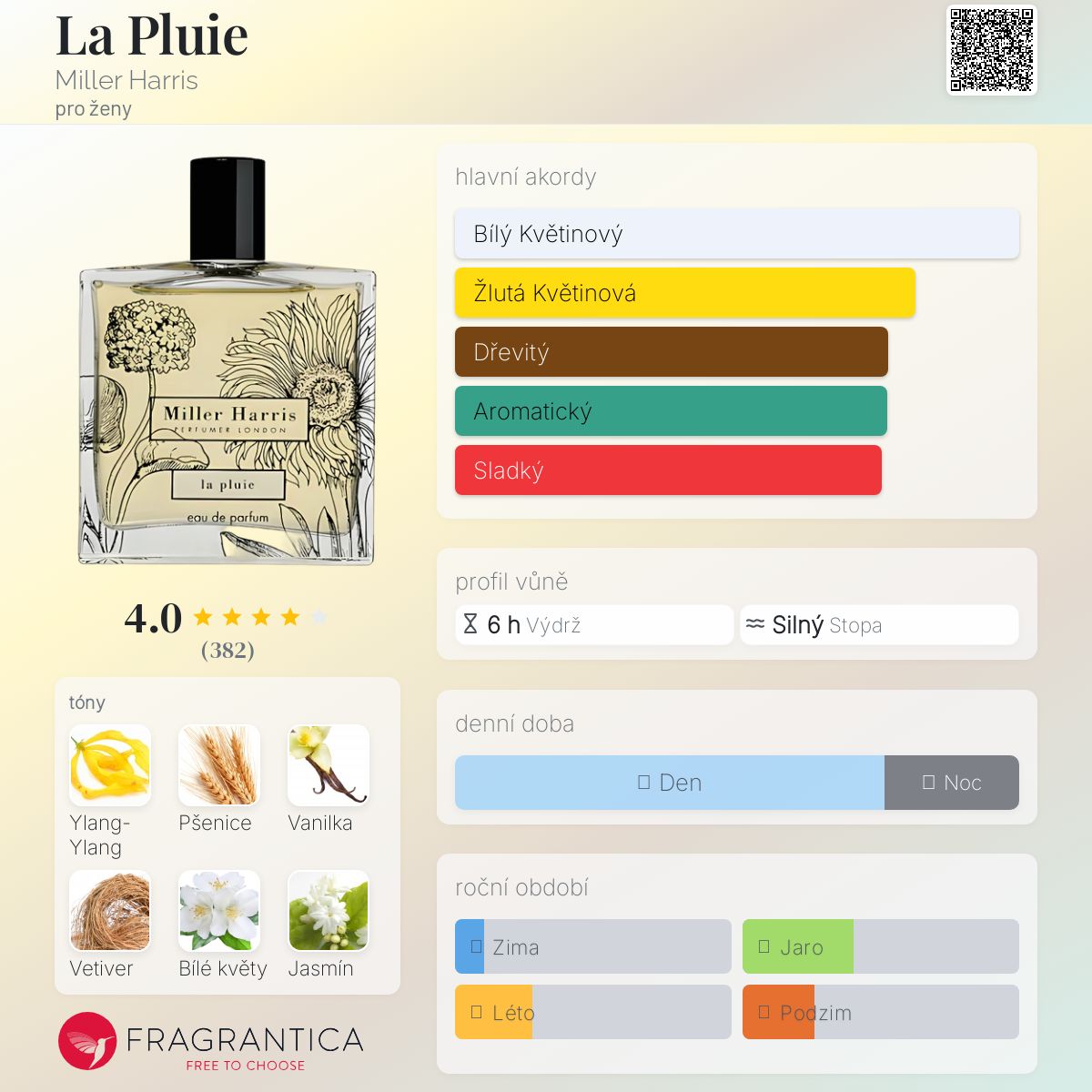 La Pluie podle Miller Harris je Floral vůně pro ženy. La Pluie byl/a uveden/a v roce 2011. Vrchní tóny jsou Pšenice, Levandule, Mandarinka a Bergamot; střední tóny jsouYlang-Ylang, Bílé květy, Jasmín, Květ afrického pomeranče a Bourbonská kasie ; základní tóny jsou Vanilka a Vetiver.