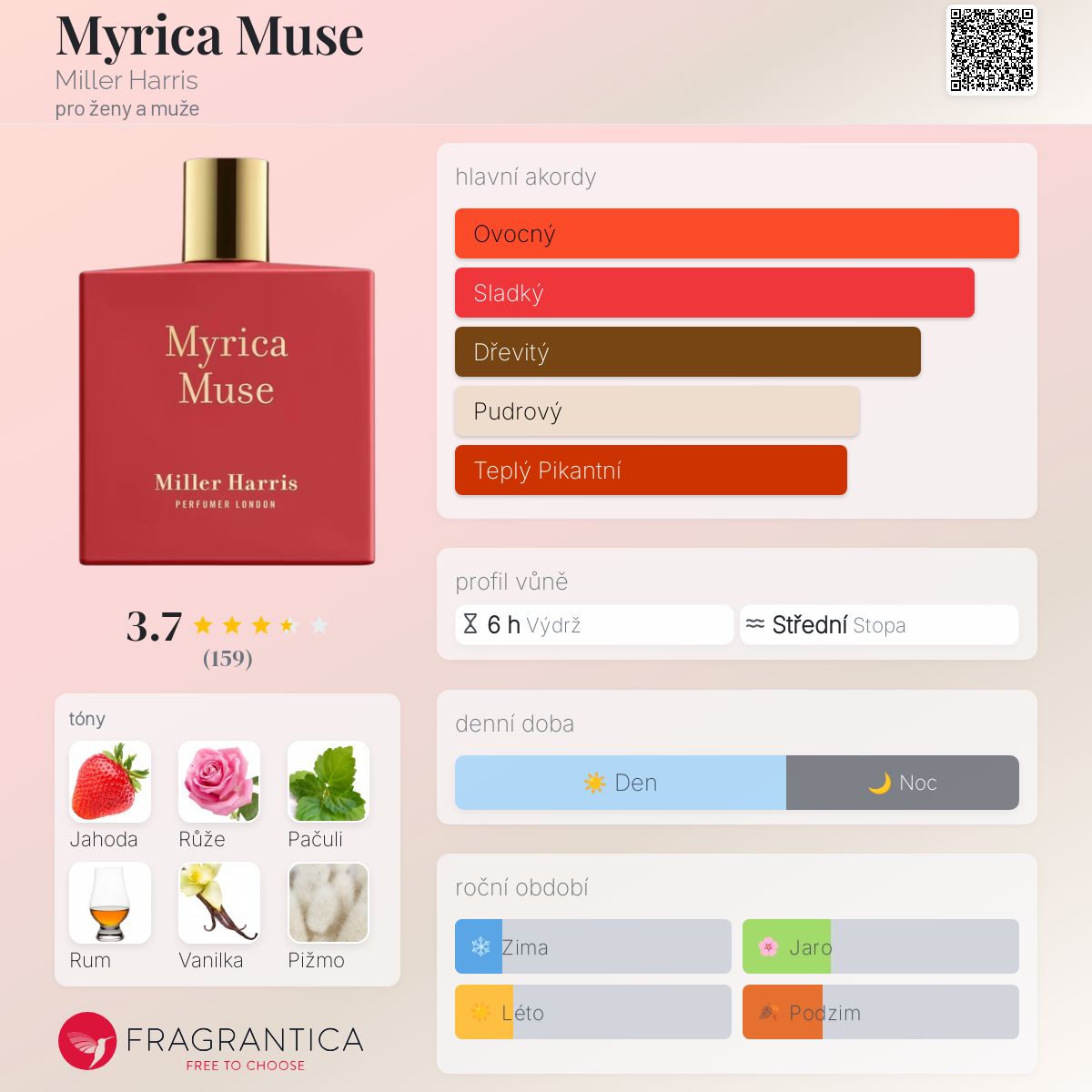 Myrica Muse podle Miller Harris je Floral Fruity vůně pro ženy a muže. Myrica Muse byl/a uveden/a v roce 2022. "Nosem" za touto vůní je Emilie Bouge. Vrchní tóny jsou Jahoda, Vřesna, Růžový pepř a Mandarinka; střední tóny jsouRůže, Pačuli, Rum, Jasmín a Konvalinka ; základní tóny jsou Vanilka, Pižmo, Santalové dřevo, Jantar (ambra) a Benzoin.