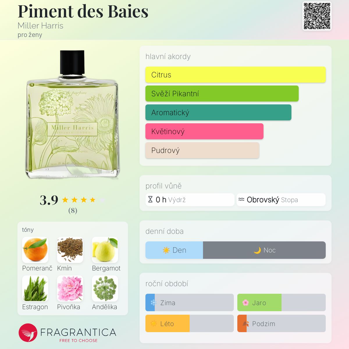 Piment des Baies podle Miller Harris je Orientální vůně pro ženy. Piment des Baies byl/a uveden/a v roce 2002. "Nosem" za touto vůní je Lyn Harris. Vrchní tóny jsou Pomeranč, Kmín, Bergamot a Estragon; střední tóny jsouPivoňka a Andělika ; základní tóny jsou Kosatec, Santalové dřevo a Madagaskarská vanilka.