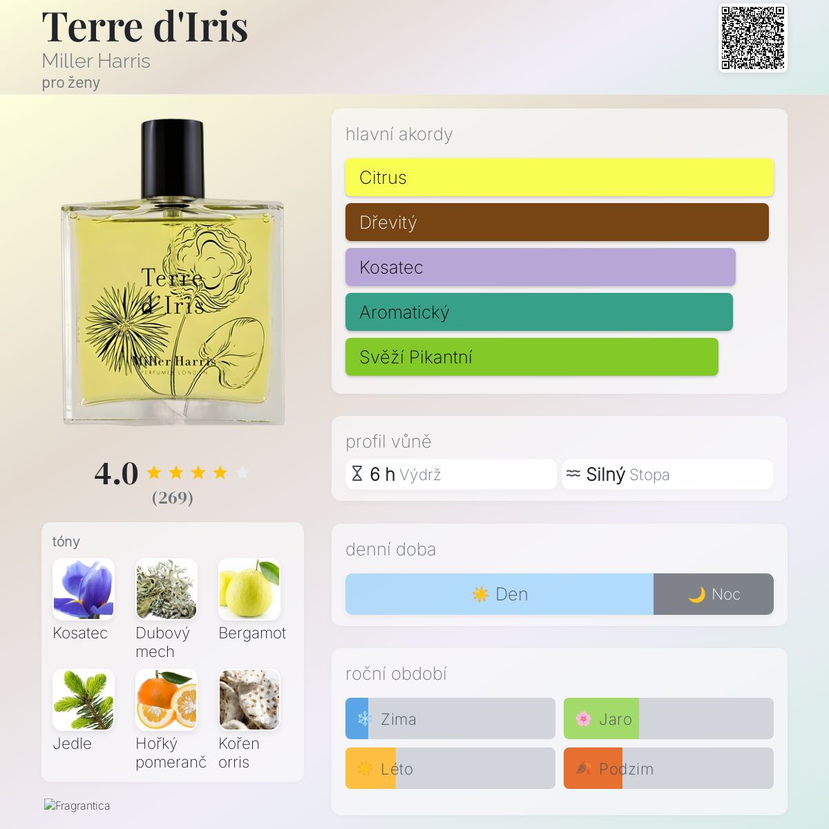 Terre d'Iris podle Miller Harris je Chypre Floral vůně pro ženy. Terre d'Iris byl/a uveden/a v roce 2000. Vrchní tóny jsou Bergamot, Hořký pomeranč a Grapefruit; střední tóny jsouRozmarýn, Květ afrického pomeranče, Šalvěj a Růže ; základní tóny jsou Kosatec, Dubový mech, Jedle, Orris, Pryskyřice a Pačuli.