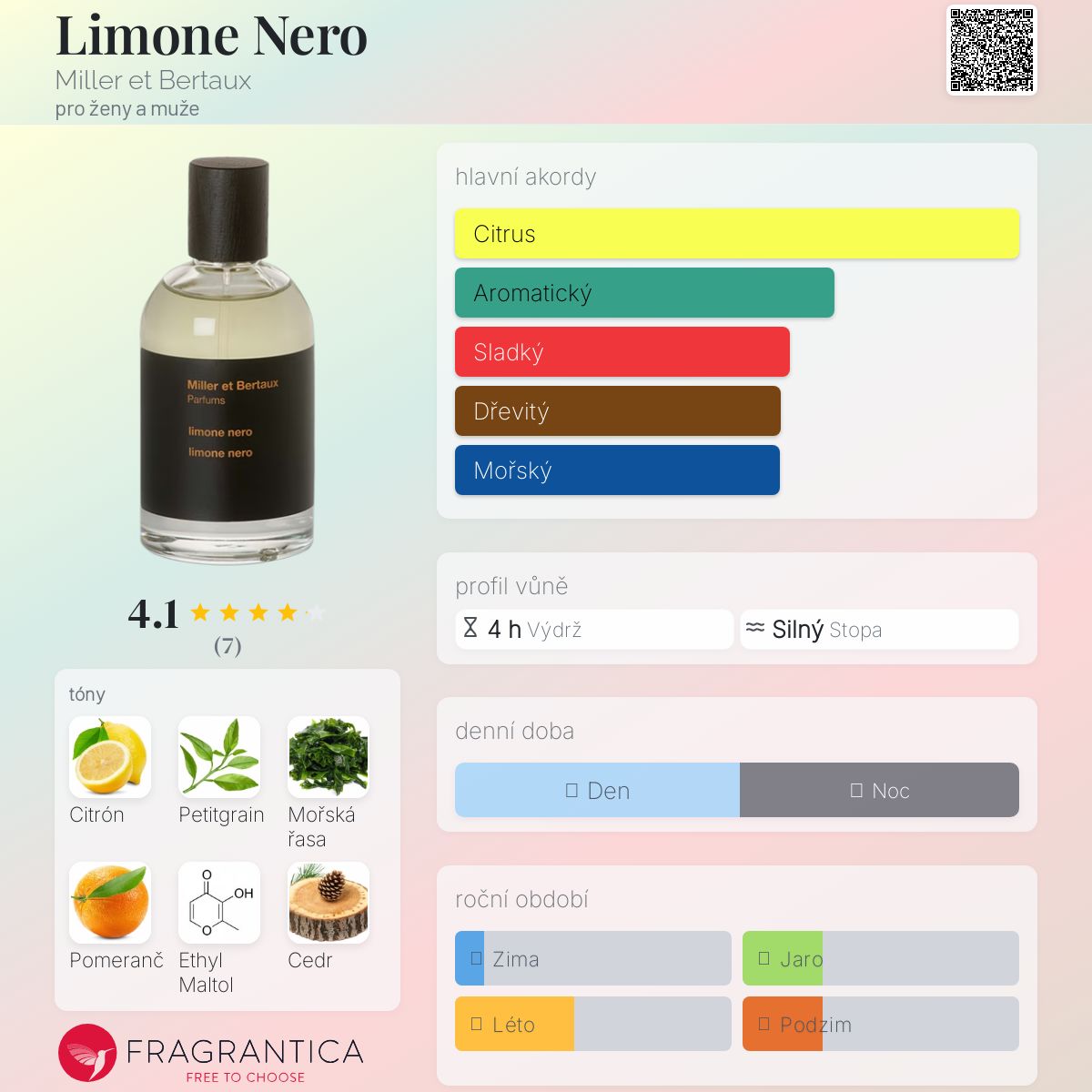 Limone Nero podle Miller et Bertaux je Citrus vůně pro ženy a muže. Toto je nová vůně. Limone Nero byl/a uveden/a v roce 2025. "Nosem" za touto vůní je Vincent Ricord. Vrchní tóny jsou Citrón, Mořská řasa a Pomeranč; střední tón jePetitgrain ; základní tóny jsou Maltol, Cedr, Ambroxan a Pižmo.
