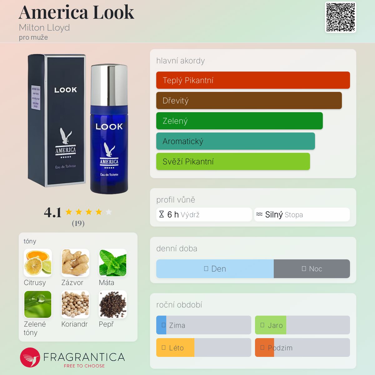 America Look podle Milton Lloyd je Woody Spicy vůně pro muže. Vrchní tóny jsou Citrusy, Máta a Zelené tóny; střední tóny jsouZázvor, Koriandr, Pepř a Cedr ; základní tóny jsou Jantar (ambra), Kadidlo, Pačuli a Santalové dřevo.