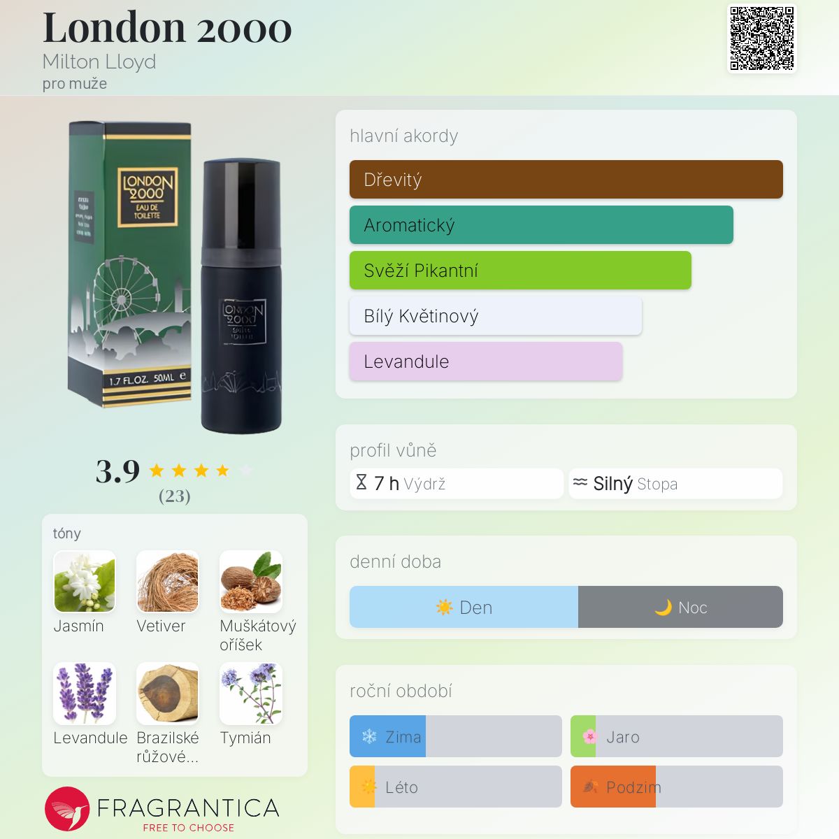 London 2000 podle Milton Lloyd je Aromatic Fougere vůně pro muže. Vrchní tóny jsou Muškátový oříšek, Levandule, Tymián a Mandarinka; střední tóny jsouJasmín a Brazilské růžové dřevo ; základní tóny jsou Vetiver, Vanilka, Cedr a Labdanum.