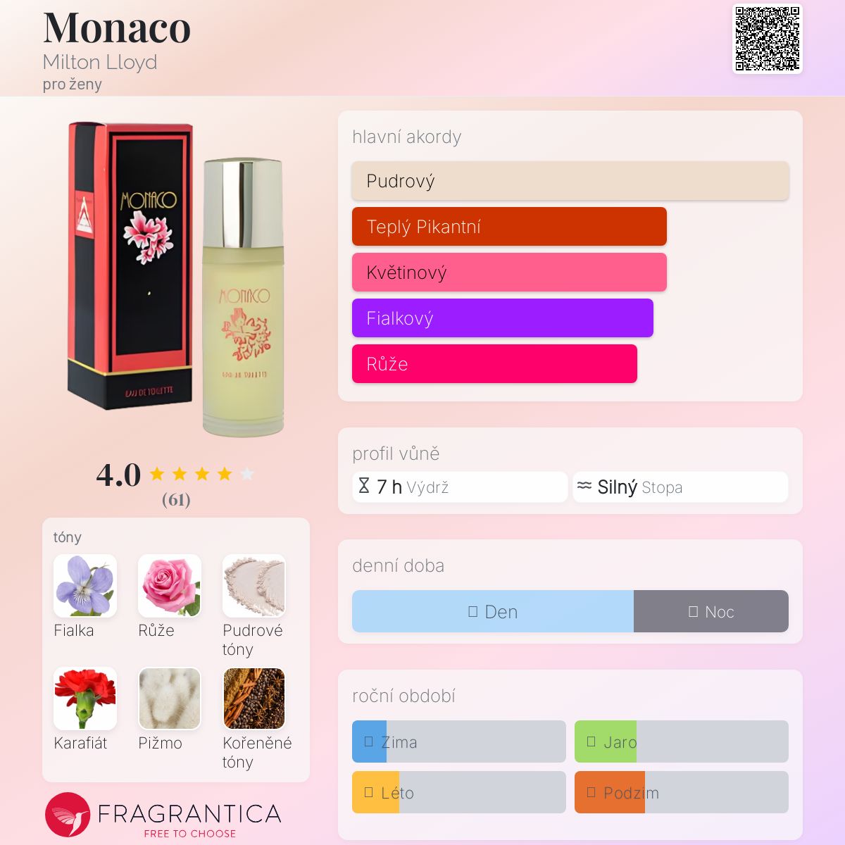 Monaco podle Milton Lloyd je Floral Woody Musk vůně pro ženy. Vrchní tóny jsou Fialka, Růže a Karafiát; střední tóny jsouPudrové tóny a Kořeněné tóny ; základní tóny jsou Pižmo, Santalové dřevo, Pačuli a Vanilka.