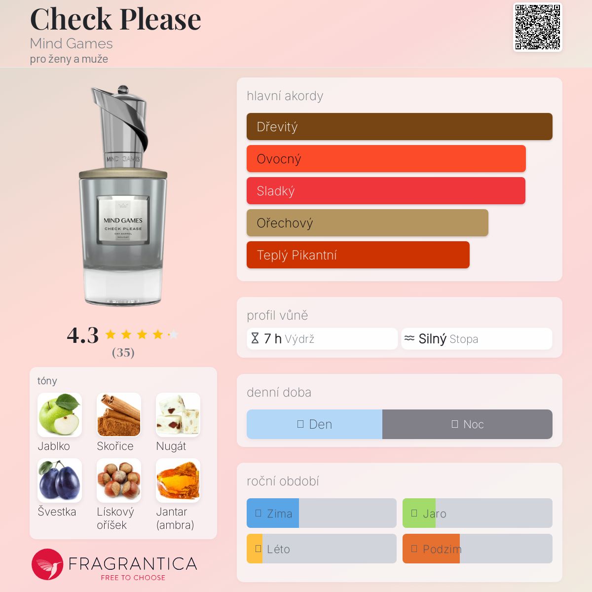 Check Please podle Mind Games je Orientální Woody vůně pro ženy a muže. Toto je nová vůně. Check Please byl/a uveden/a v roce 2025. Vrchní tóny jsou Zelené jablko, Nugát a Lískový oříšek; střední tóny jsouSkořice, Švestka a Bulharská růže ; základní tóny jsou Jantar (ambra), Dub, Bourbonská vanilka a Santalové dřevo.
