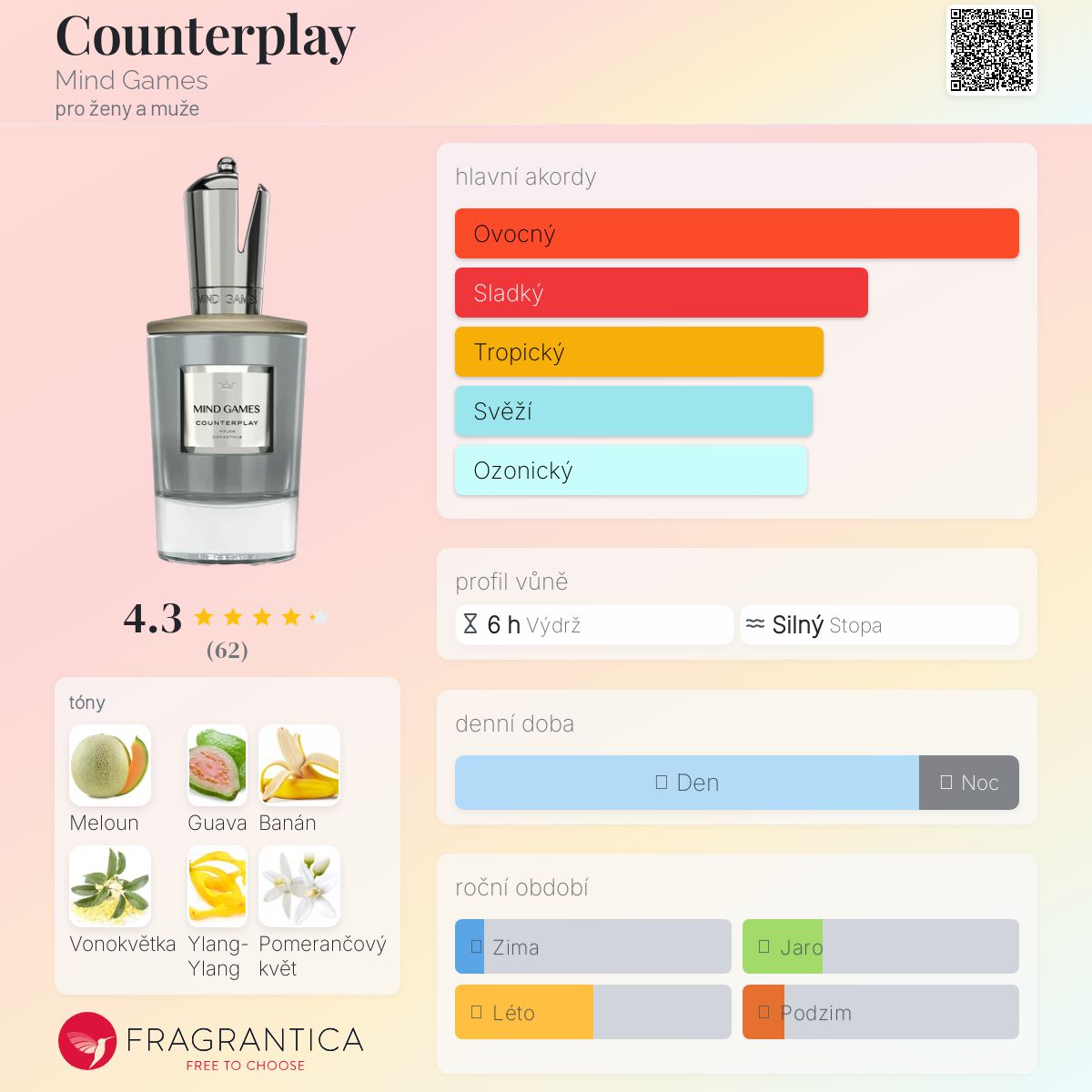 Counterplay podle Mind Games je Floral Fruity vůně pro ženy a muže. Toto je nová vůně. Counterplay byl/a uveden/a v roce 2024. "Nosem" za touto vůní je Christelle Laprade. Vrchní tóny jsou Meloun, Guava a Banán; střední tóny jsouVonokvětka, Ylang-Ylang a Pomerančový květ ; základní tóny jsou Pačuli, Santalové dřevo a Růžový pepř.