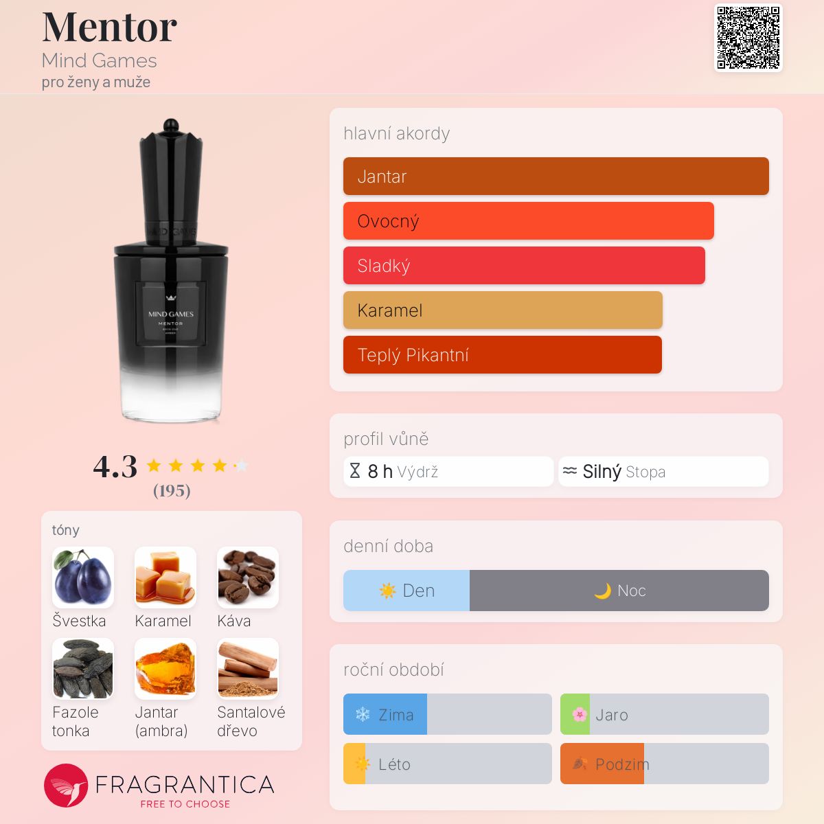 Mentor podle Mind Games je vůně pro ženy a muže. Mentor byl/a uveden/a v roce 2024. Vrchní tóny jsou Švestka, Karamel a Italský citrón; střední tóny jsouKáva, Jantar (ambra), Pryskyřice a Černý rybíz ; základní tóny jsou Fazole tonka, Santalové dřevo a Agarové dřevo (oud).