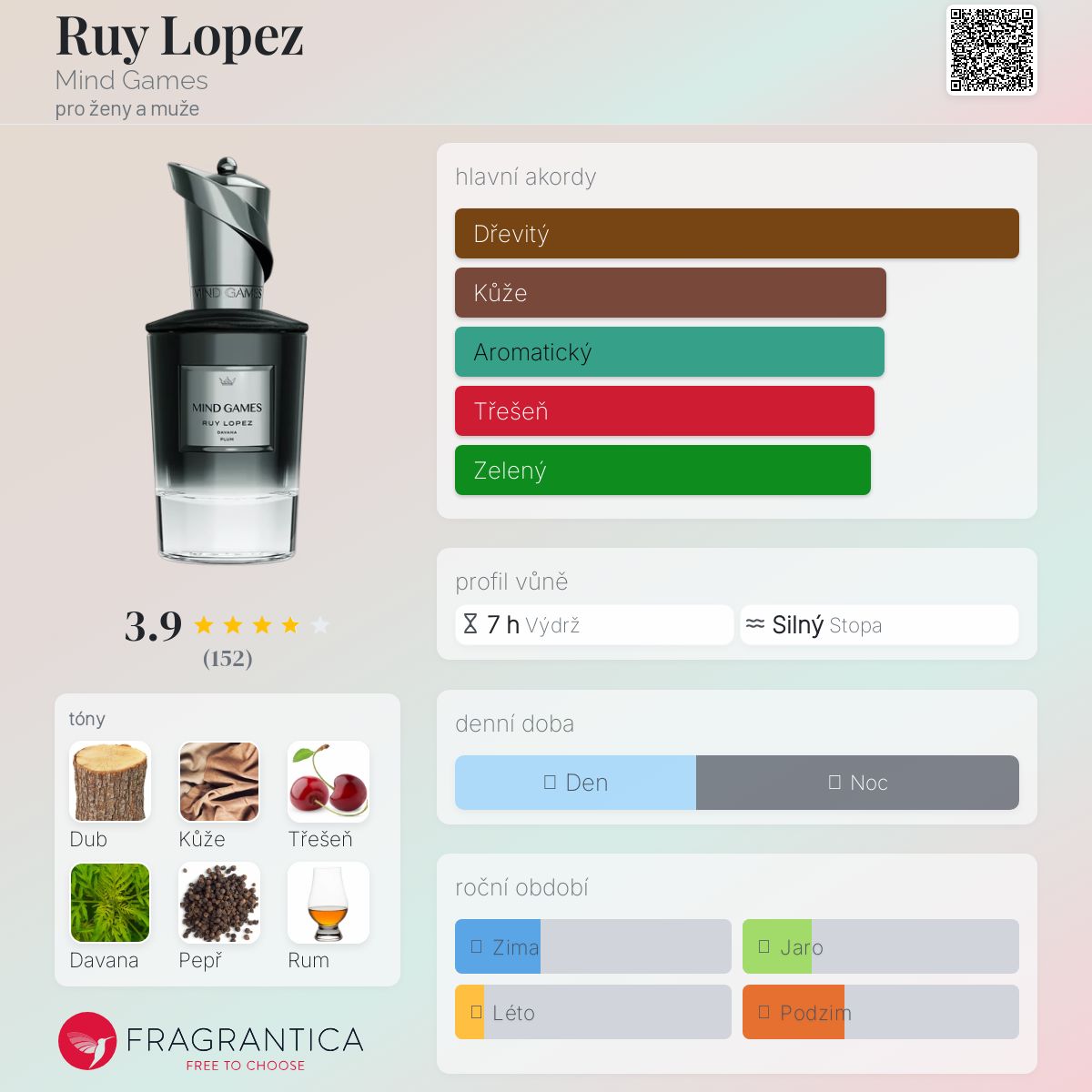 Ruy Lopez podle Mind Games je vůně pro ženy a muže. Ruy Lopez byl/a uveden/a v roce 2023. "Nosem" za touto vůní je Christelle Laprade. Vrchní tóny jsou Třešeň, Černý pepř a Černý čaj; střední tóny jsouRum, Davana a Růže ; základní tóny jsou Dub, Kůže a Pačuli.