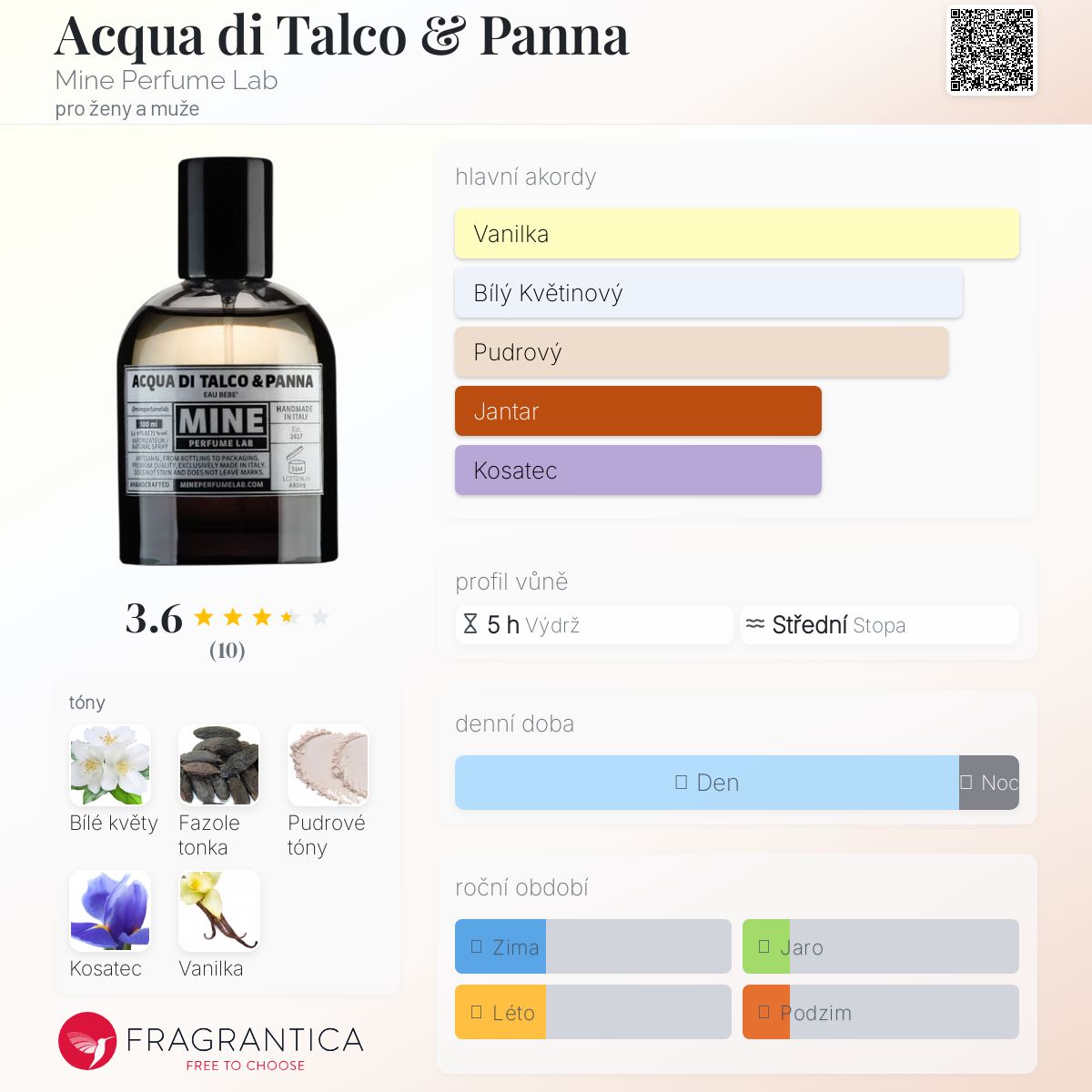 Acqua di Talco & Panna podle Mine Perfume Lab je Orientální Vanilla vůně pro ženy a muže. Acqua di Talco & Panna byl/a uveden/a v roce 2016. Vrchní tón je Bílé květy ; střední tón jePudrové tóny ; základní tóny jsou Fazole tonka, Kosatec a Vanilka.