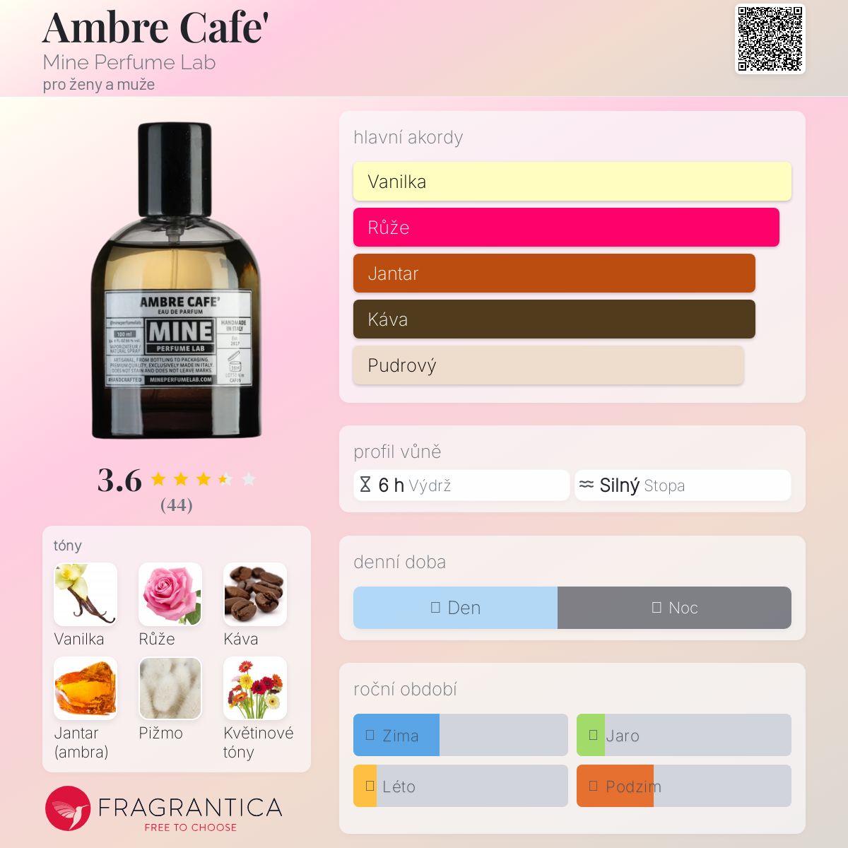Ambre Cafe' podle Mine Perfume Lab je vůně pro ženy a muže. Ambre Cafe' byl/a uveden/a v roce 2018. Vrchní tón je Květinové tóny ; střední tóny jsouRůže a Káva ; základní tóny jsou Vanilka, Jantar (ambra) a Bílé pižmo.