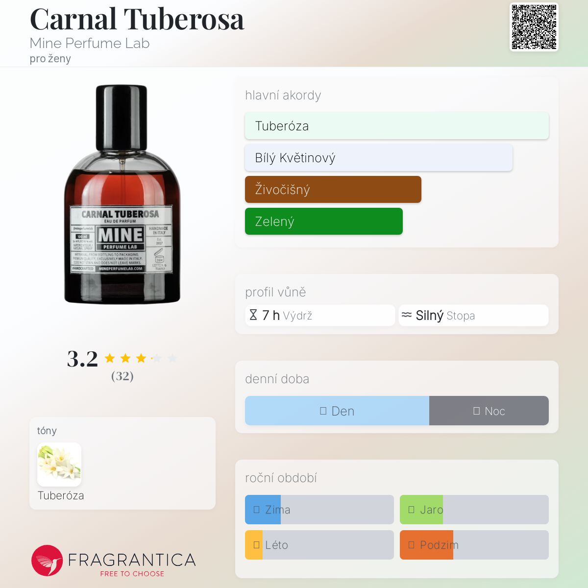 Carnal Tuberosa podle Mine Perfume Lab je Floral vůně pro ženy. Carnal Tuberosa byl/a uveden/a v roce 2015. Vrchní tón je Tuberóza ; střední tón jeTuberóza ; základní tón je Tuberóza.