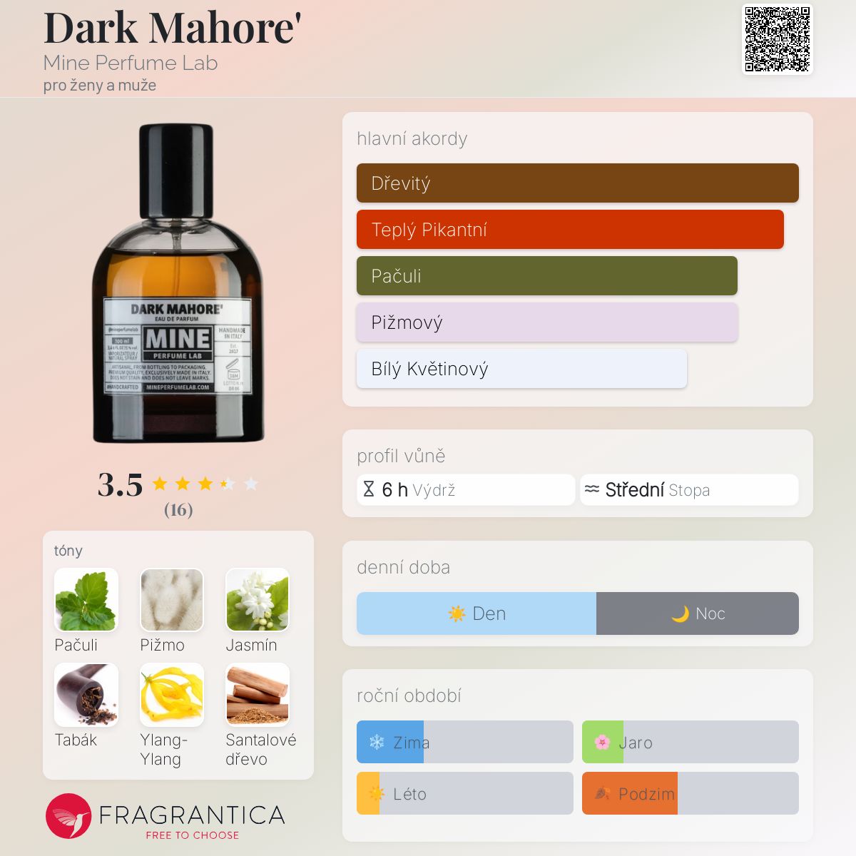 Dark Mahore' podle Mine Perfume Lab je vůně pro ženy a muže. Dark Mahore' byl/a uveden/a v roce 2019. Vrchní tóny jsou Černý pepř, Kardamom a Koření; střední tóny jsouJasmín a Ylang-Ylang ; základní tóny jsou Pačuli, Pižmo, Tabák a Santalové dřevo.