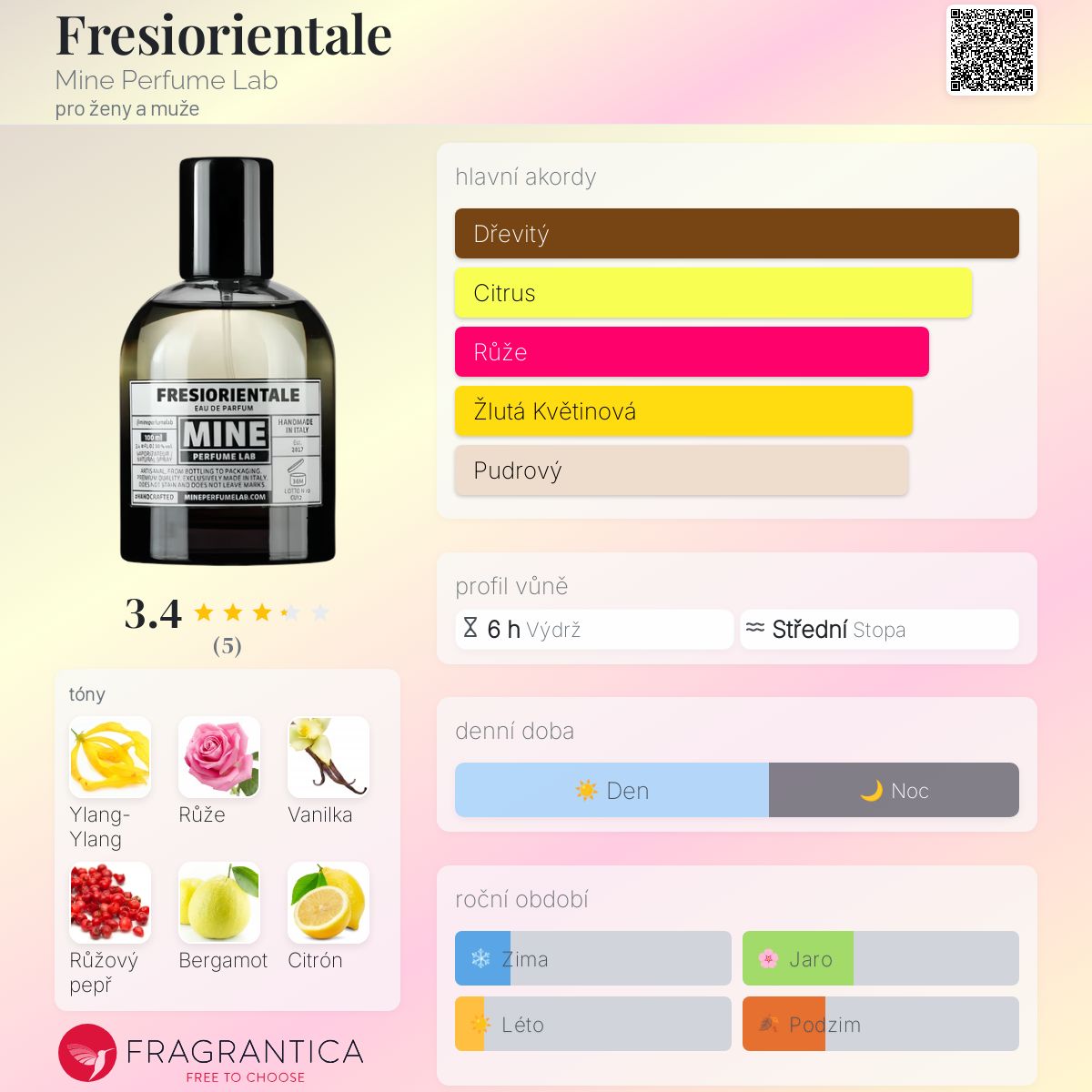Fresiorientale podle Mine Perfume Lab je vůně pro ženy a muže. Toto je nová vůně. Fresiorientale byl/a uveden/a v roce 2024. Vrchní tóny jsou Růžový pepř, Bergamot a Citrón; střední tóny jsouYlang-Ylang, Růže, Jasmín a Konvalinka ; základní tóny jsou Vanilka, Santalové dřevo, Pižmo a Cedr.