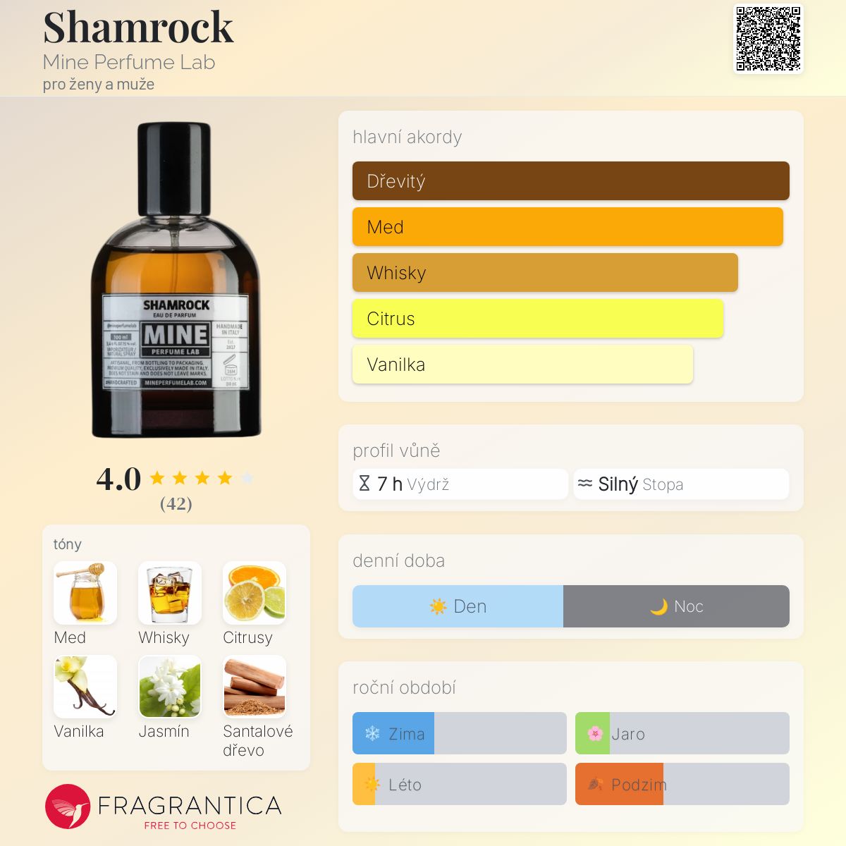 Shamrock podle Mine Perfume Lab je vůně pro ženy a muže. Shamrock byl/a uveden/a v roce 2019. Vrchní tón je Citrusy ; střední tóny jsouMed, Whisky a Jasmín ; základní tóny jsou Vanilka a Santalové dřevo.