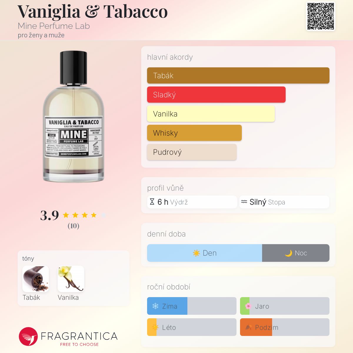 Vaniglia & Tabacco podle Mine Perfume Lab je Orientální Vanilla vůně pro ženy a muže. Vaniglia & Tabacco byl/a uveden/a v roce 2015. Vrchní tóny jsou Tabák a Vanilka; střední tóny jsouTabák a Vanilka ; základní tóny jsou Tabák a Vanilka.