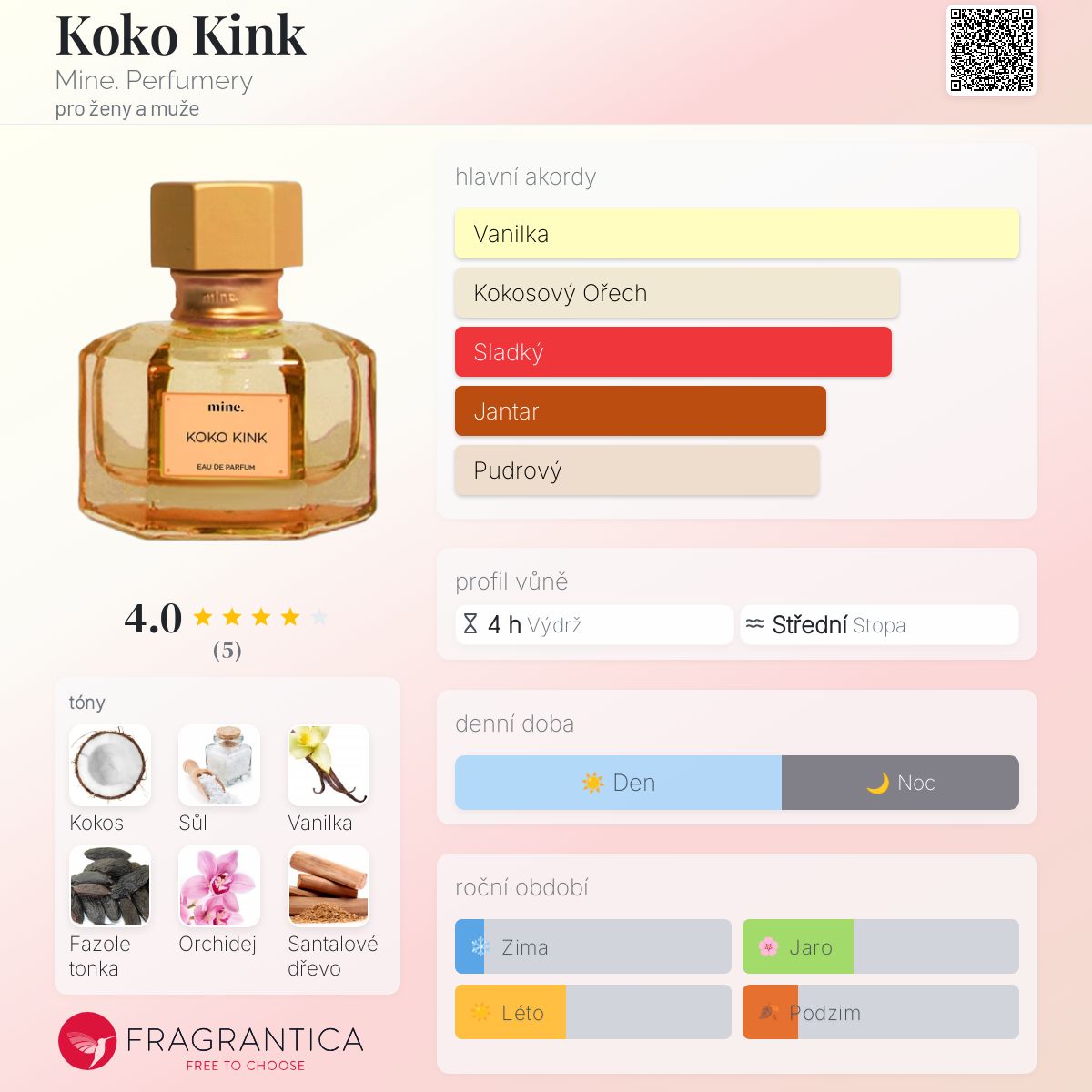 Koko Kink podle Mine. Perfumery je Orientální Vanilla vůně pro ženy a muže. Koko Kink byl/a uveden/a v roce 2022. Vrchní tóny jsou Kokos, Mořská sůl a Vanilka; střední tóny jsouFazole tonka, Orchidej a Solární tóny ; základní tóny jsou Santalové dřevo, Benzoin a Pižmo.